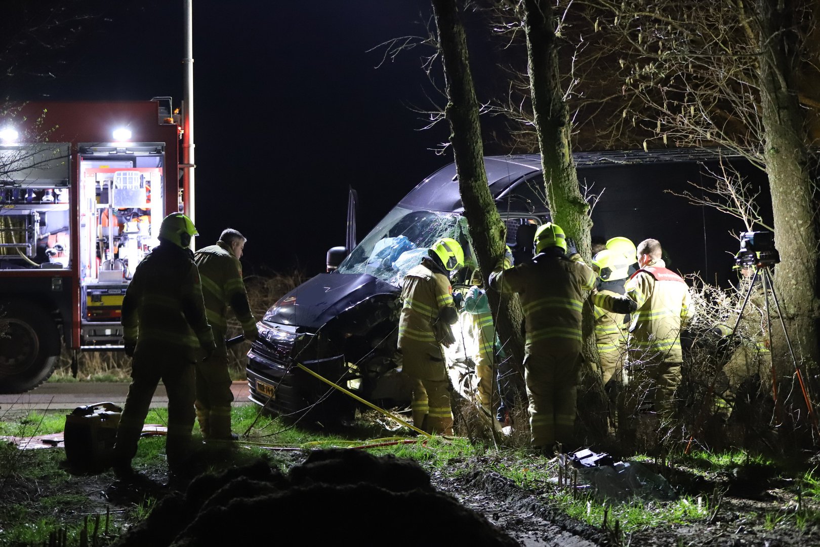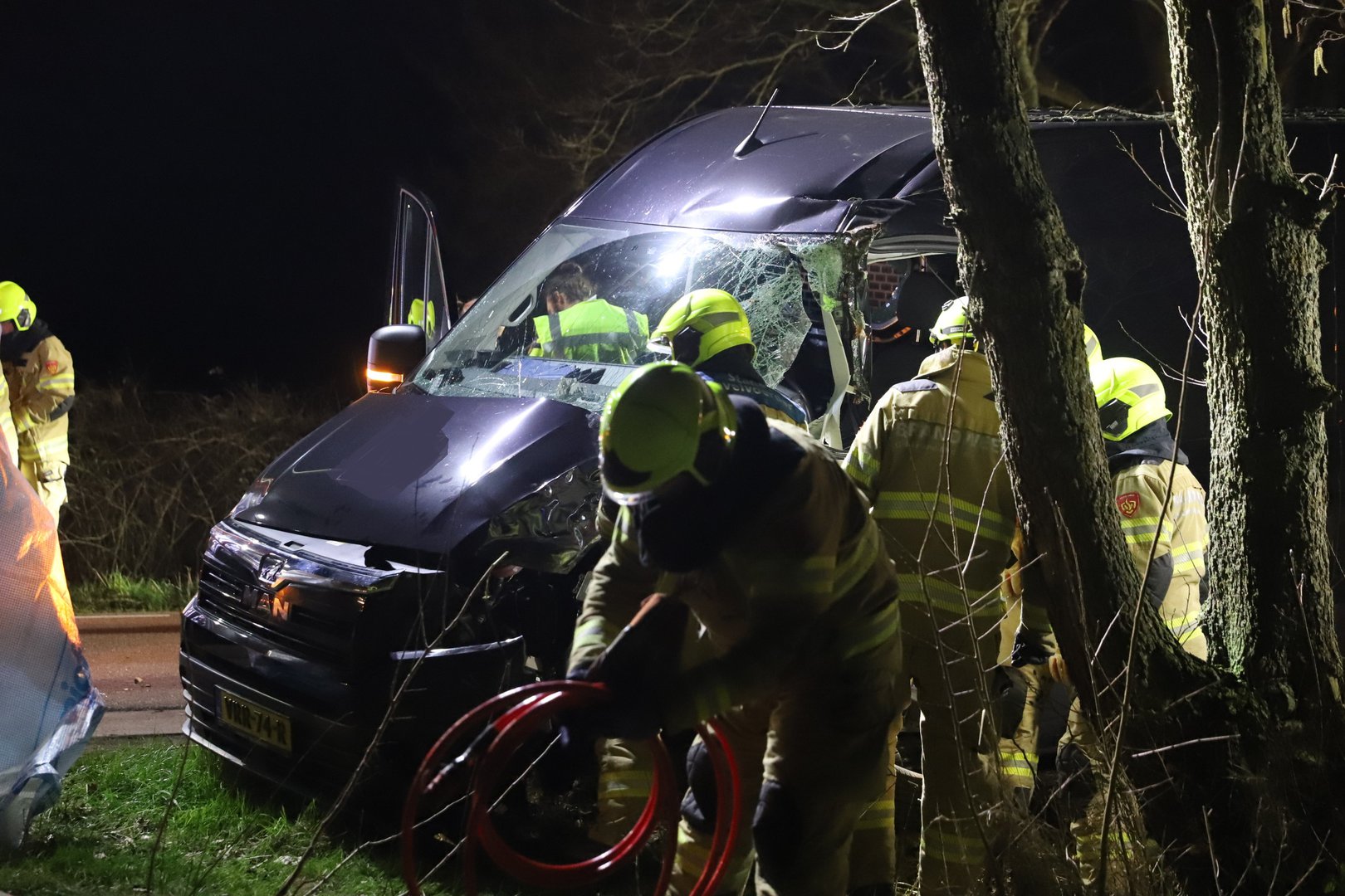 De bestelbus raakte door het ongeval zwaar beschadigd. Waarom de bestuurder de macht over het stuur verloor is nog onduidelijk.
