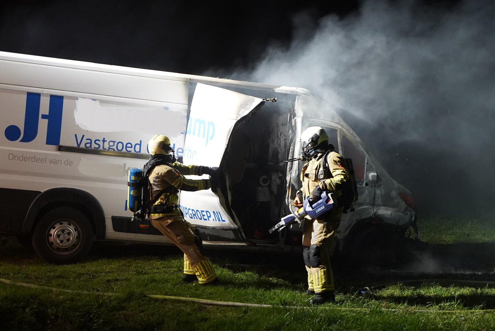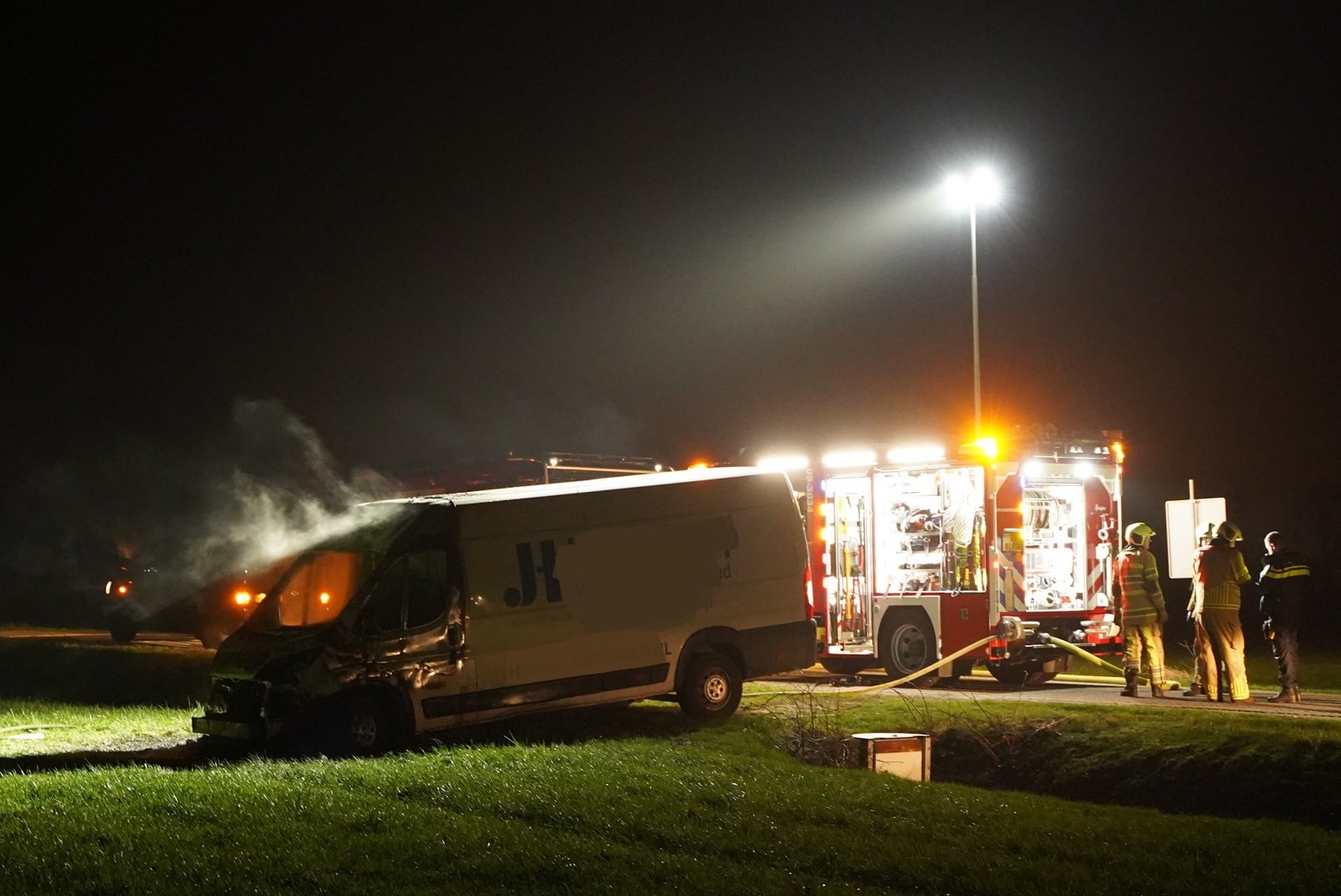 De brandweer was snel ter plaatsen maar kon niet voorkomen dat het busje zwaar beschadigd raakte. De bestuurder kwam met de schrik vrij.
