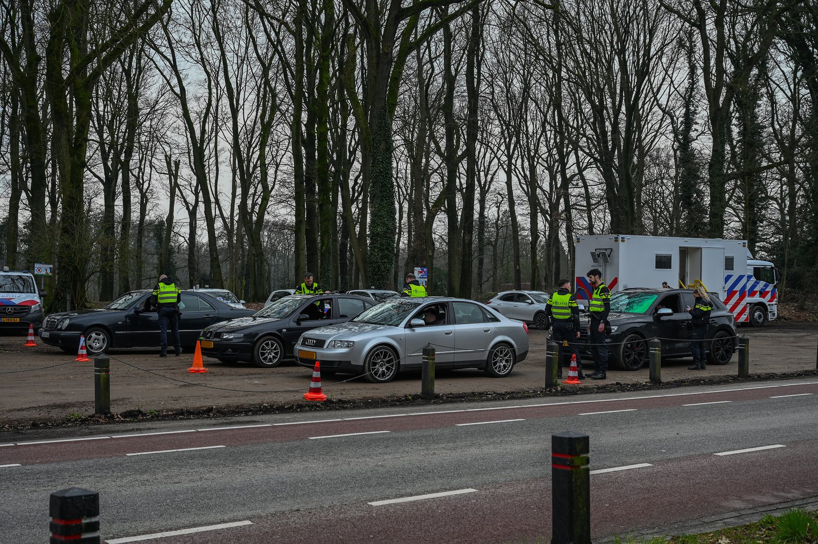Auto’s worden naar de parkeerplaats geleid en daar worden papieren en auto gecontroleerd. Van één auto moest de bestuurder de raamfolie ter plekke verwijderen omdat het te donker was nadat politie een meting had gedaan.