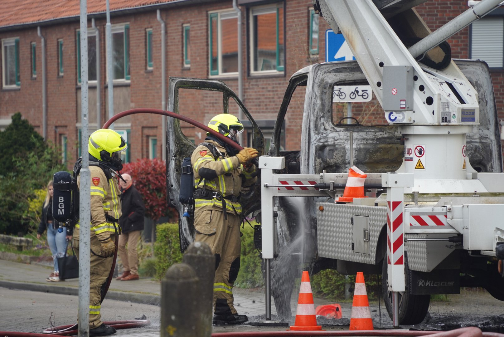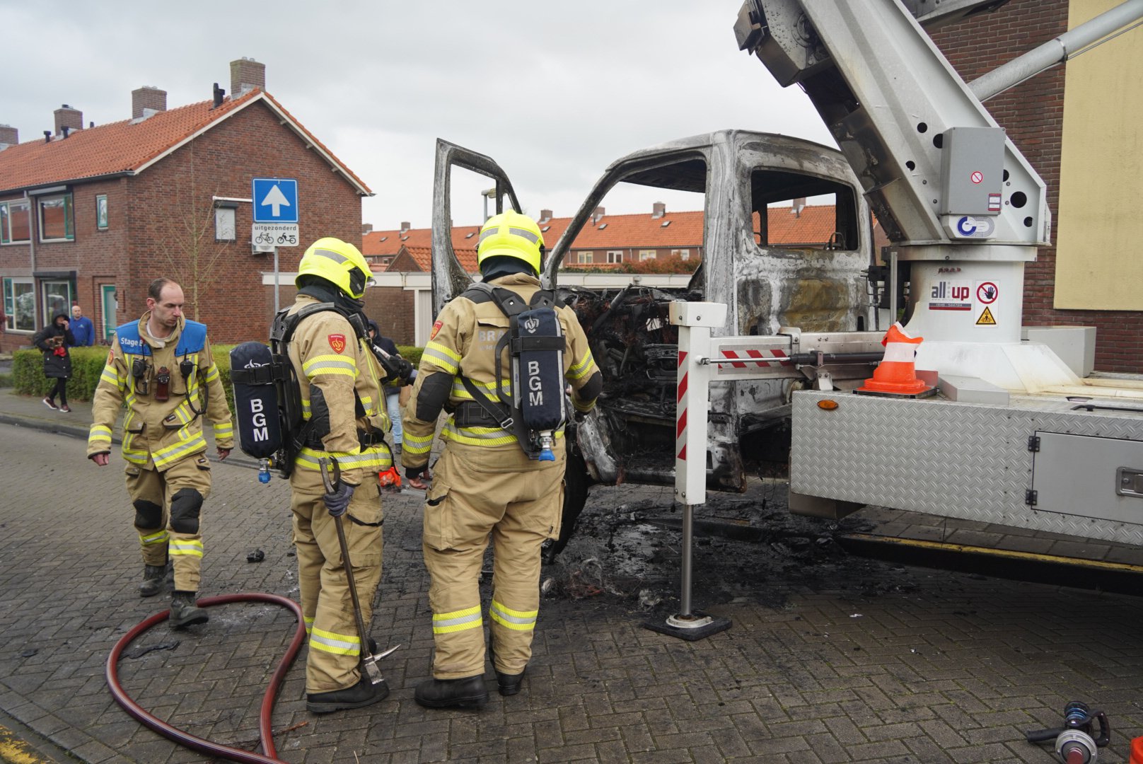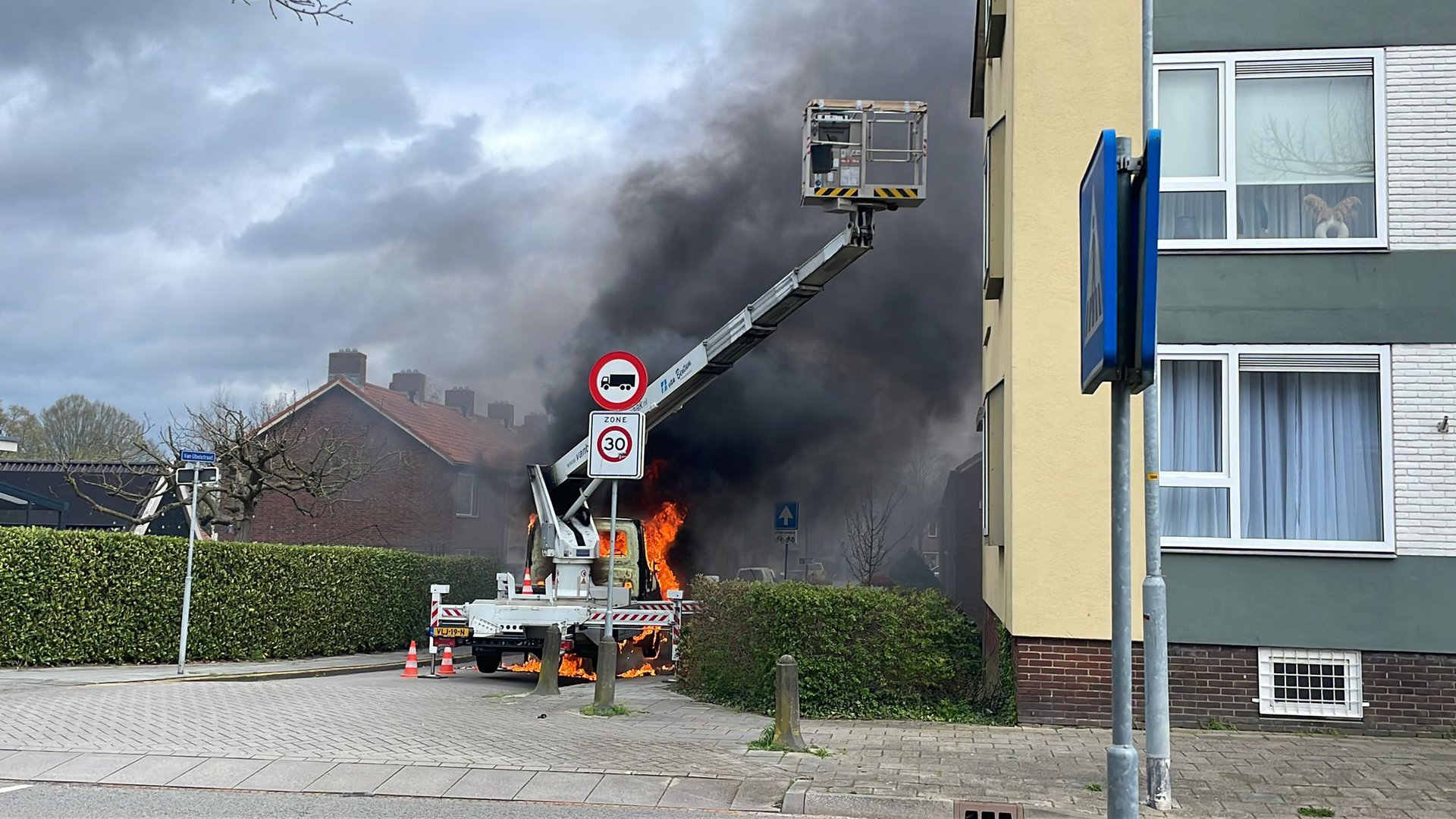 Man springt van hoogwerker nadat cabine in brand vliegt Doesburg