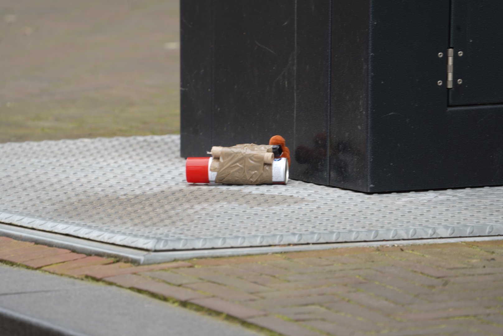 ZUTPHEN – Naast een zwarte container in het centrum van Zutphen werd zondagmiddag een verdacht pakketje aangetroffen. Het pakketje bleek te bestaan uit illegaal vuurwerk, een gasflesje en een knuffeltje in de vorm van een piemel, eraan getapet.