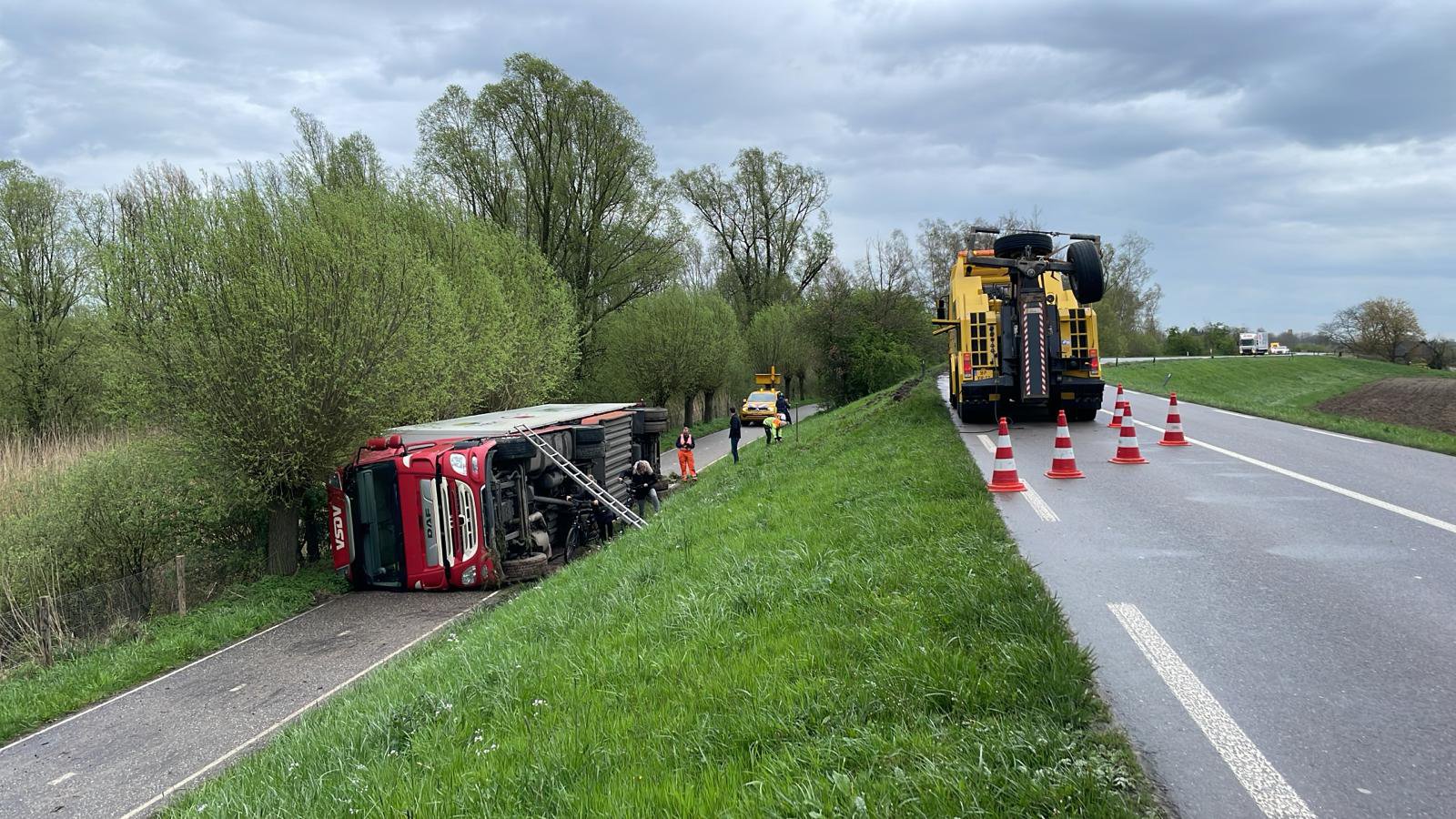 LEUTH – Vanmorgen is er een vrachtwagen met oplegger van de dijk af gereden op de kapitteldijk in Leuth, De vrachtwagen is op zijn zijkant terecht gekomen.