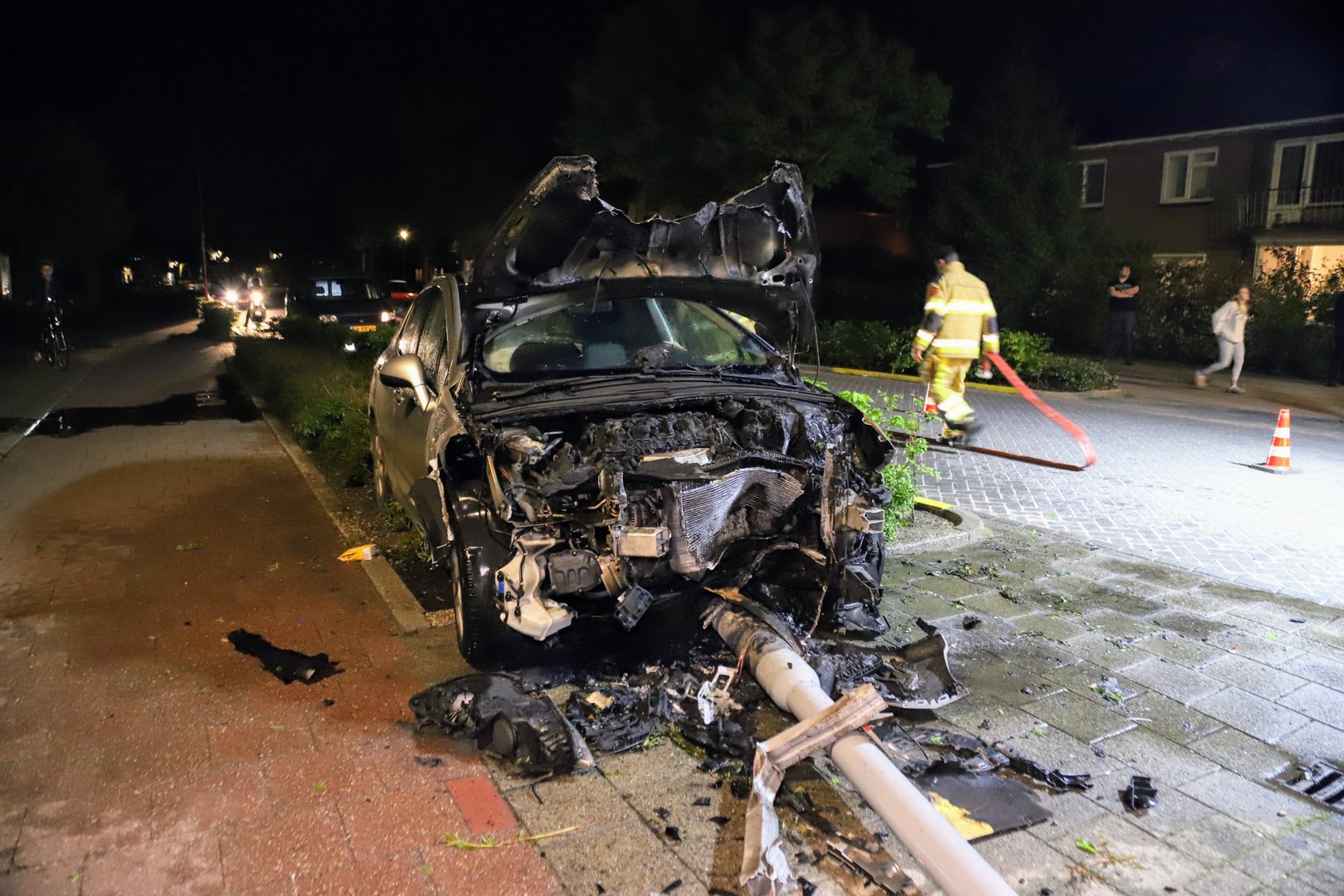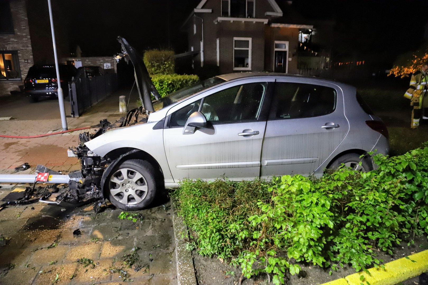 Hierbij bleek een bestuurder de macht over het stuur te zijn kwijtgeraakt. Hij reed vervolgens een lantaarnpaal omver en nam deze een aantal meters mee en kwam in een plantsoen tot stilstand. De auto vloog in brand. Toen de brandweer arriveerde was de persoon al uit de auto en aangehouden door de politie.