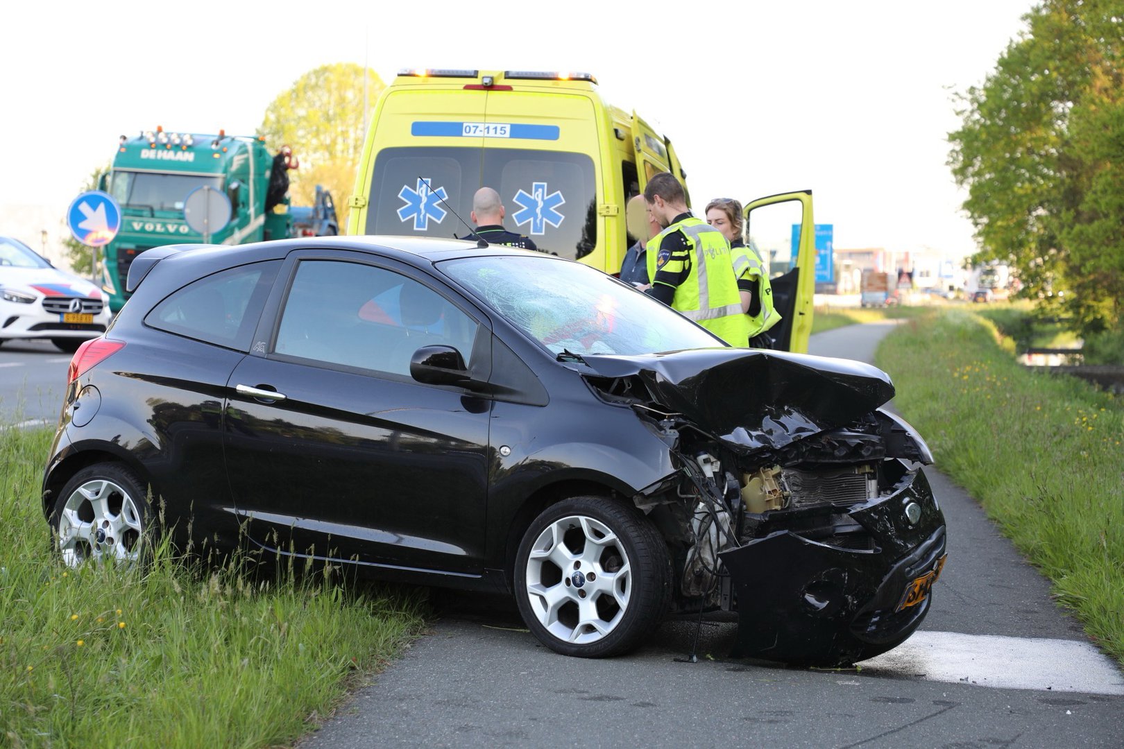 Volgens de politie ter plaatse ging het rond 06:55 uur mis door een voorrangsfout. De bestuurder van de zwarte Ford moest per ambulance naar het ziekenhuis gebracht worden. De bestuurder van de andere auto raakte lichtgewond en kreeg een verwijzing voor de huisarts.
