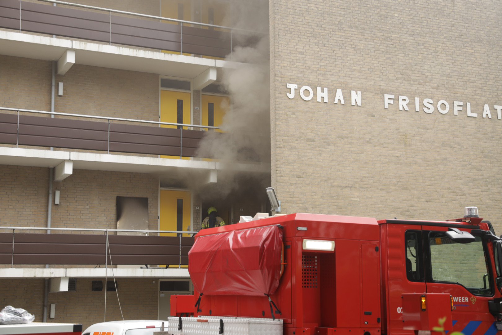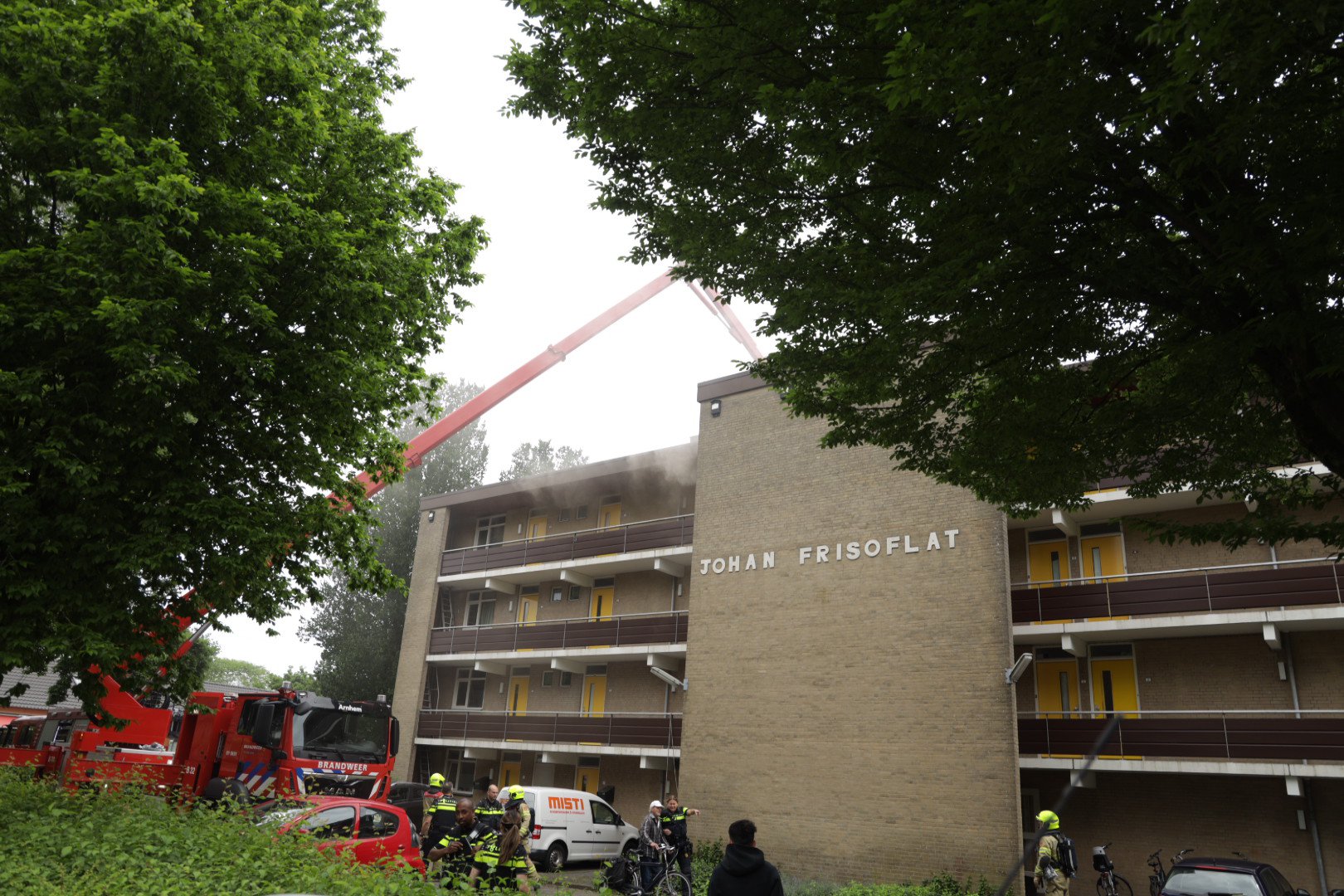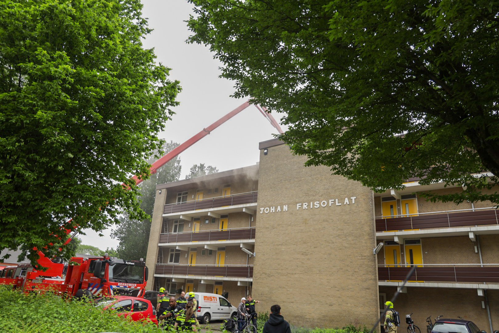 Rond 14.30 uur ontving de brandweer een melding van brand in de Johan Frisoflat. Grote rookwolken waren zichtbaar op de galerij van het gebouw. Al snel bleek dat een appartement op de eerste verdieping in brand stond.