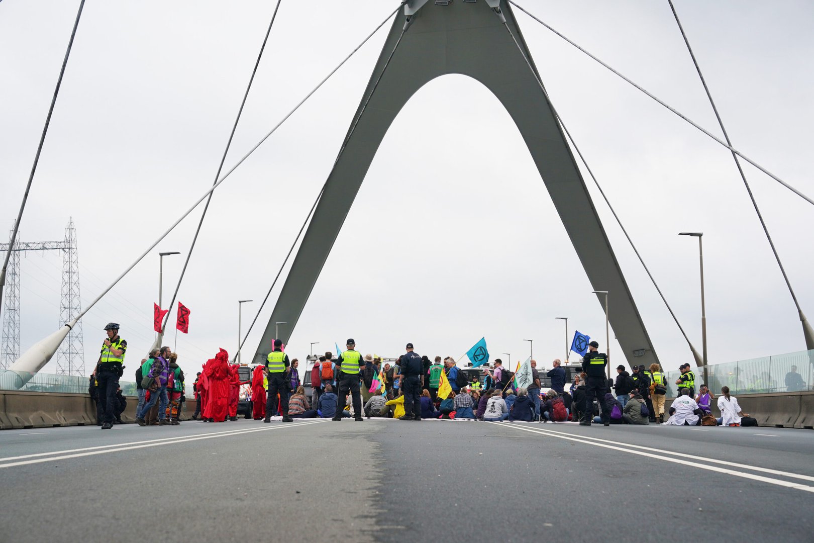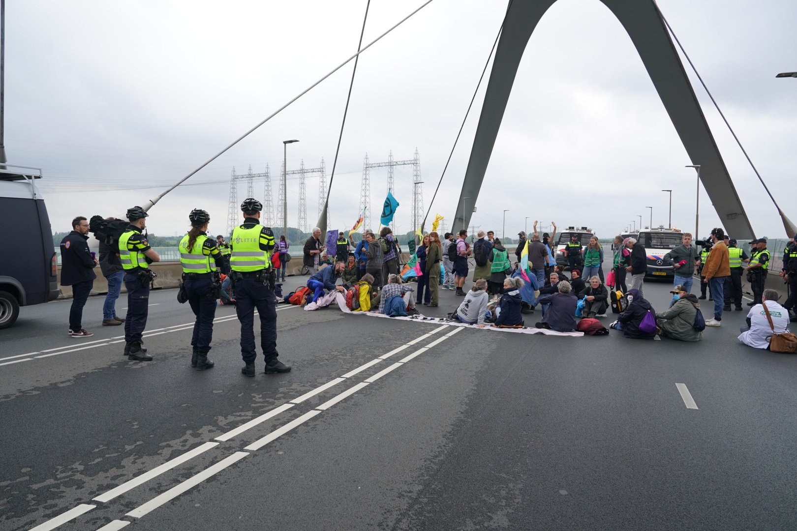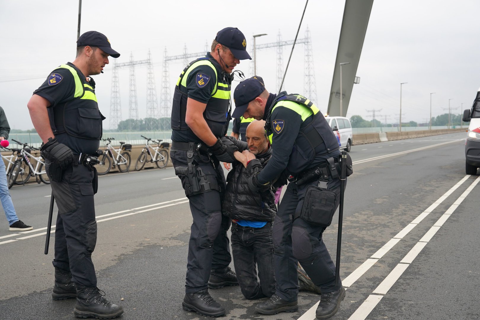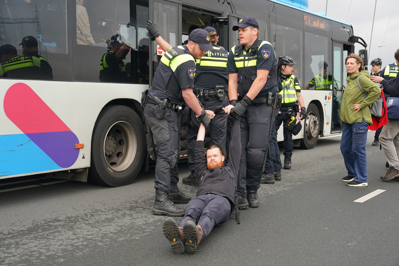 Een van de demonstranten had zichzelf aan de brug vastgebonden, maar werd door de politie losgemaakt. De demonstranten moesten vervolgens plaatsnemen in een bus die op De Oversteek stond.