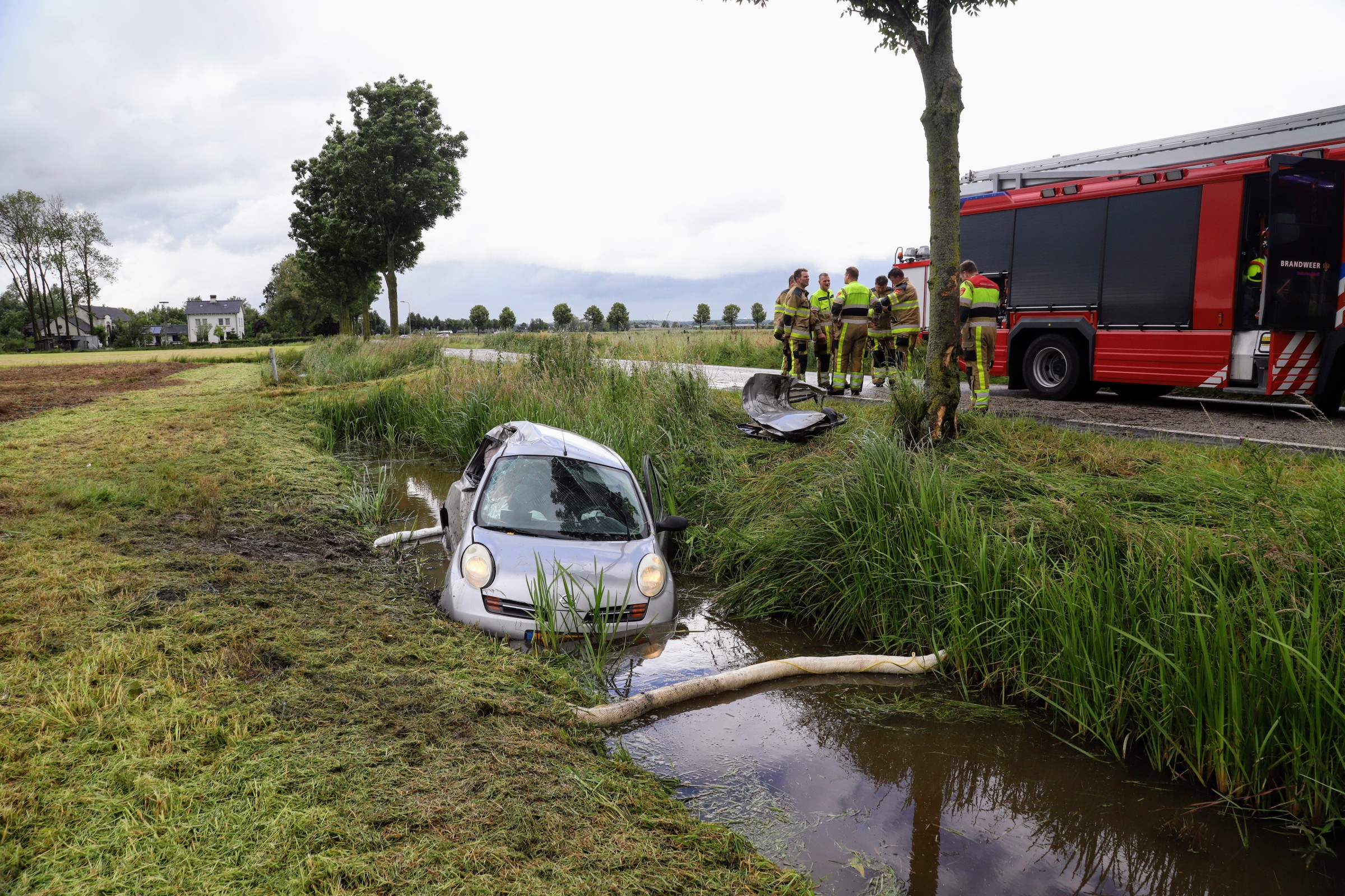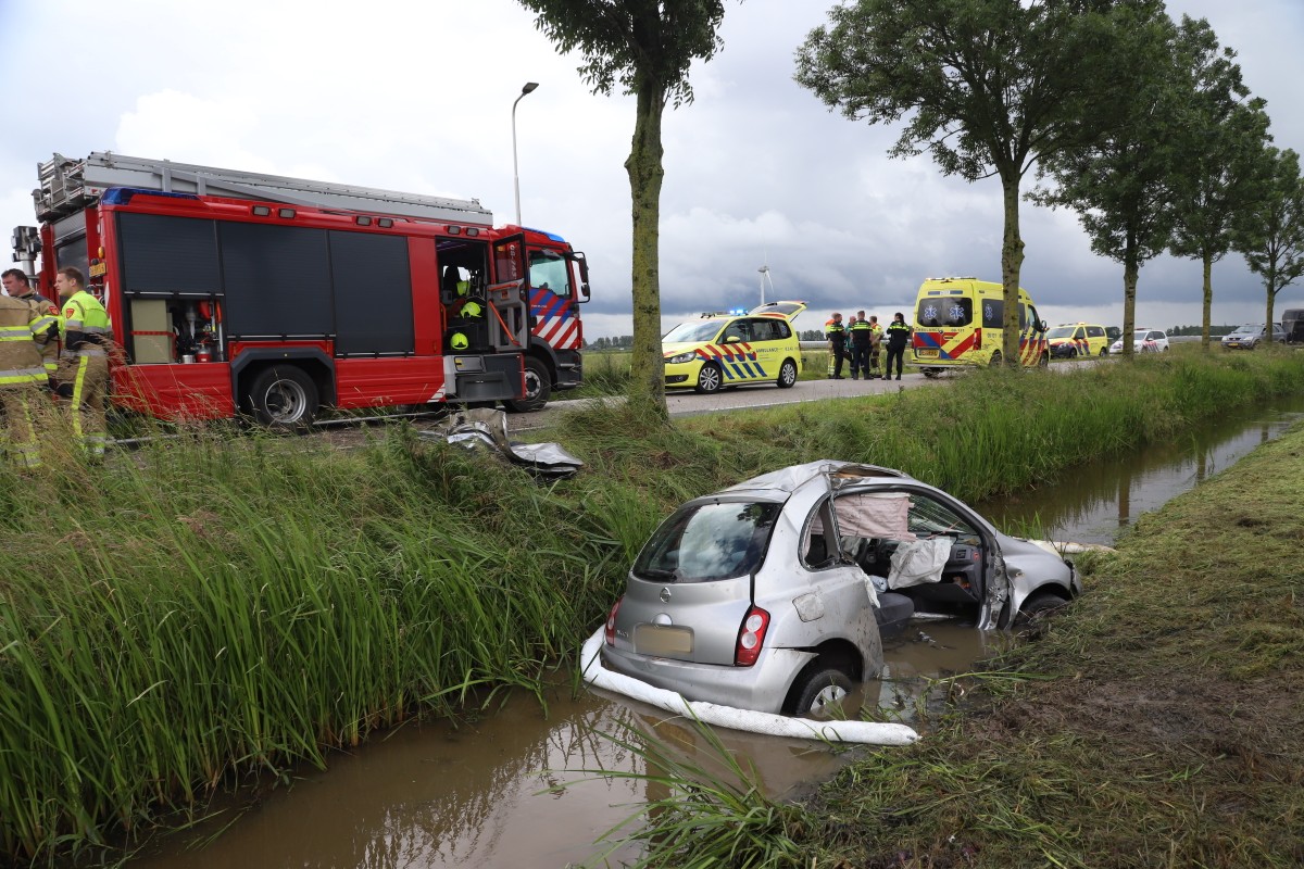 Auto belandt in sloot na botsing tegen boom, brandweer bevrijdt automobiliste