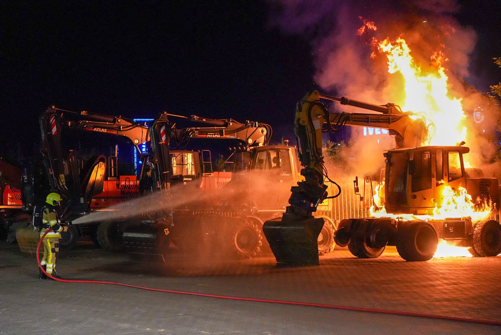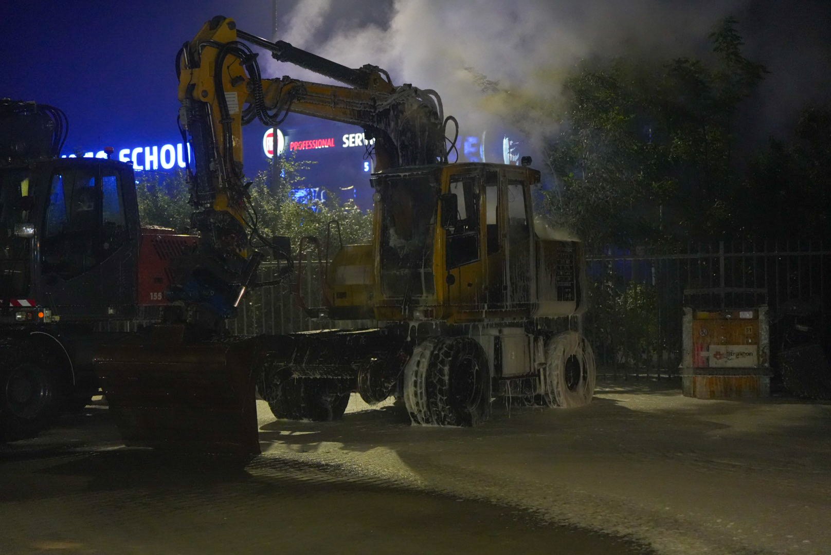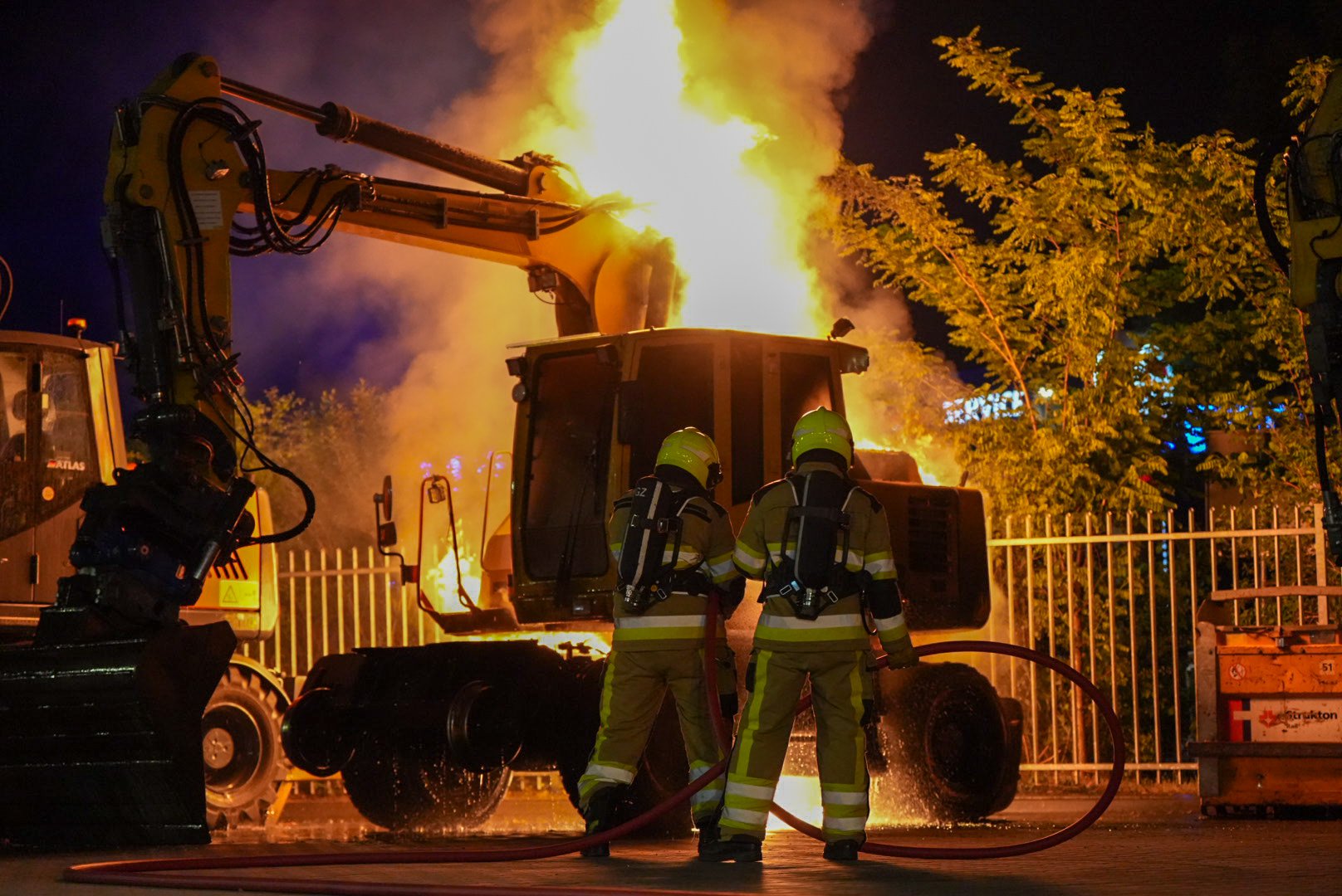 Graafmachine in lichterlaaie op bedrijventerrein