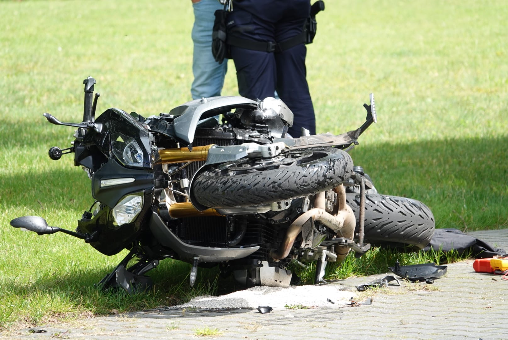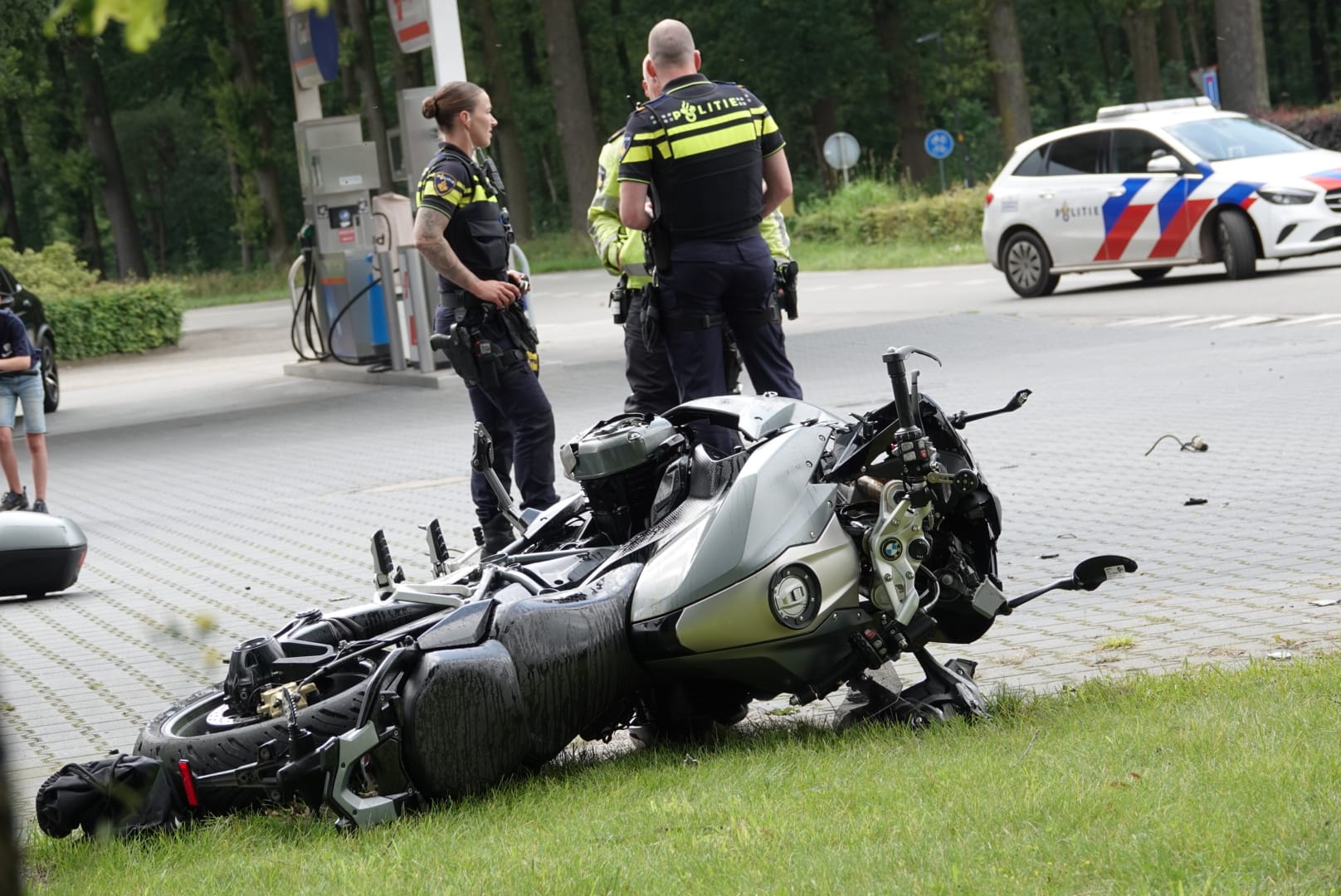 Agenten onderzoeken de toedracht van de aanrijding. De motor en motorrijder zelf kwamen door de botsing tientallen meters verder op het terrein bij het tankstation tot stilstand.