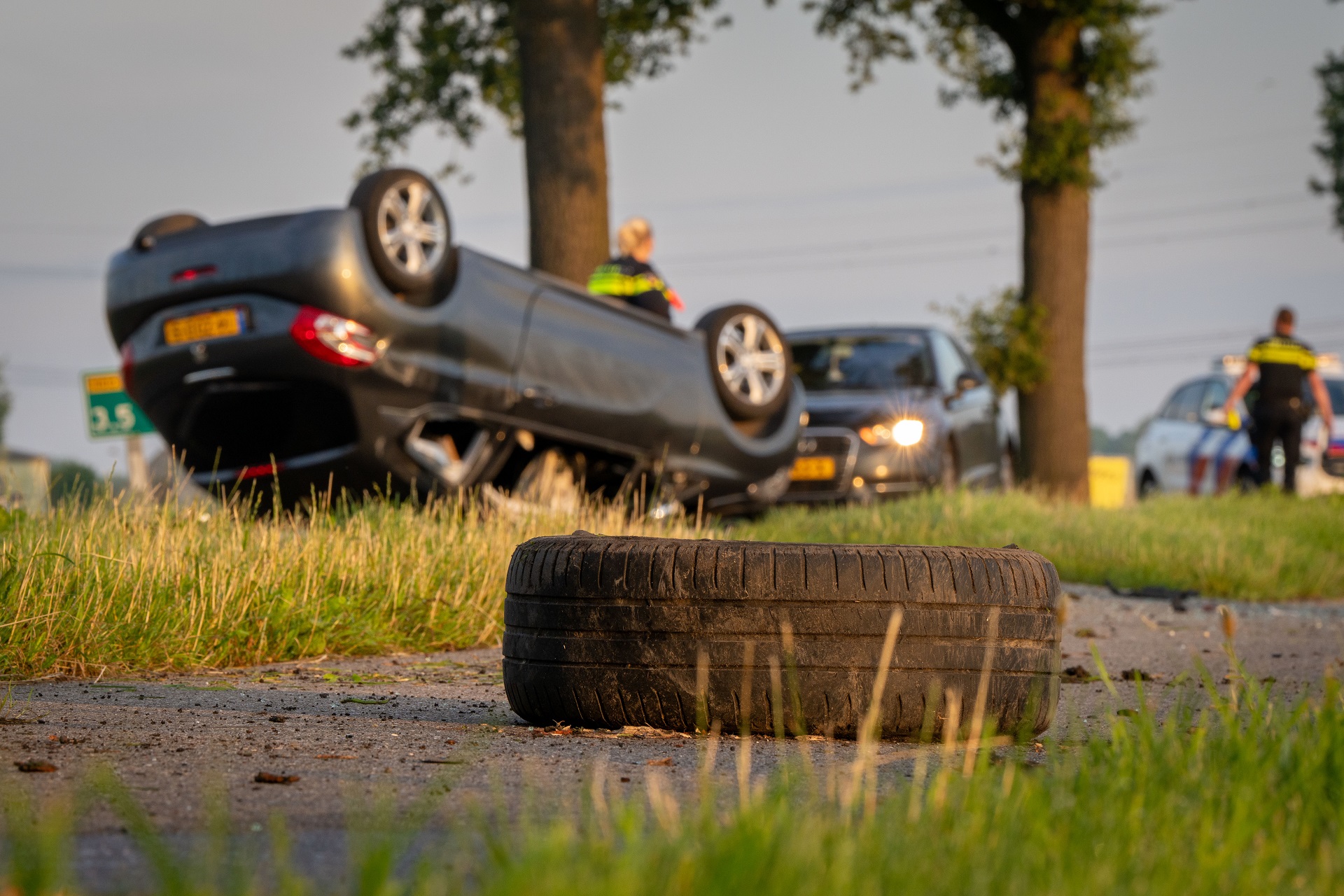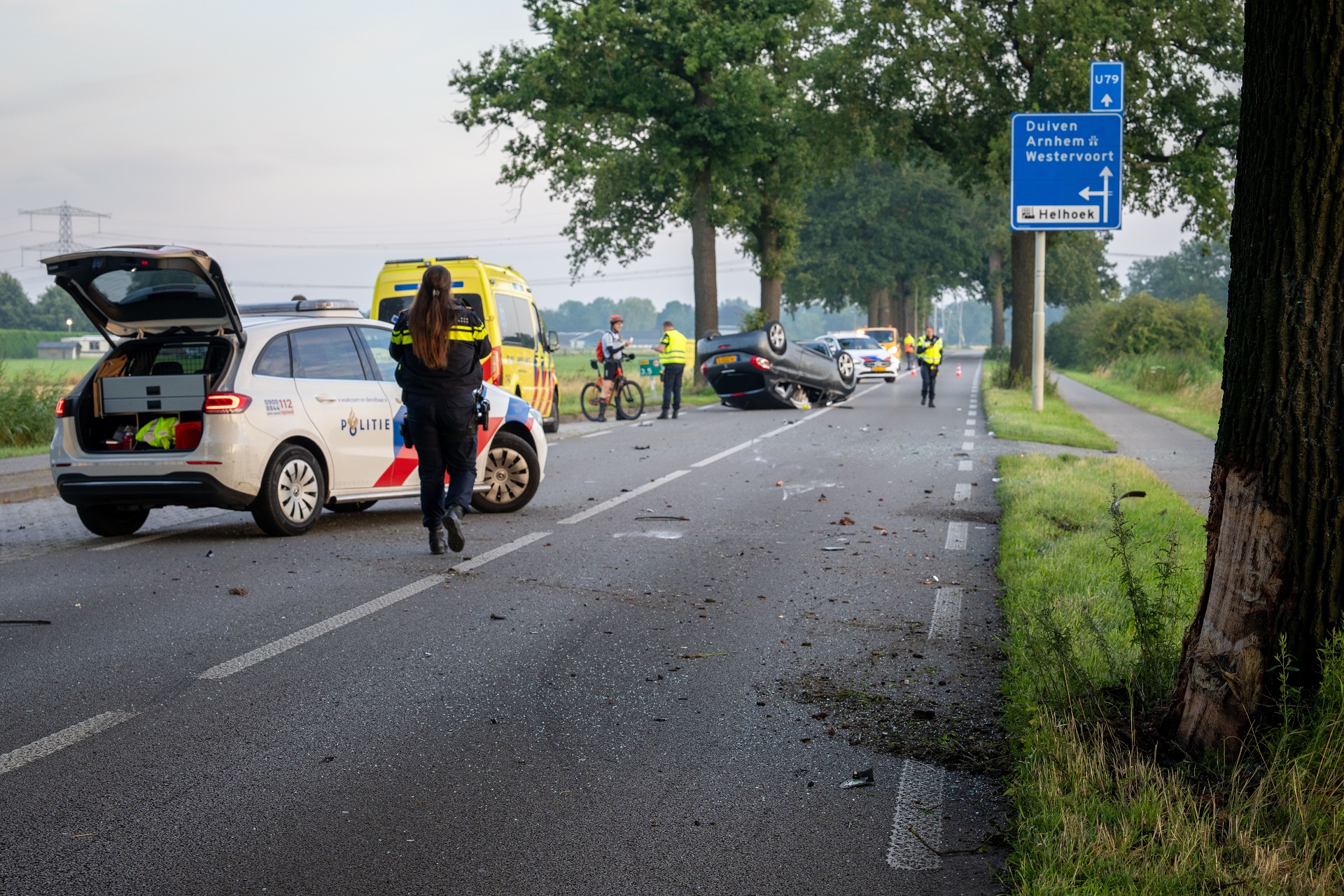 GROESSEN – Op de N810, de weg tussen Zevenaar en Duiven, is ter hoogte van Groessen een auto op de kop tot stilstand gekomen na een ongeval.