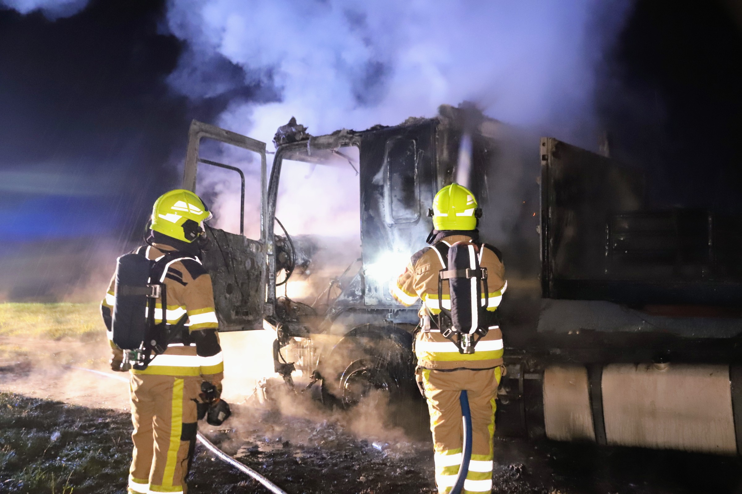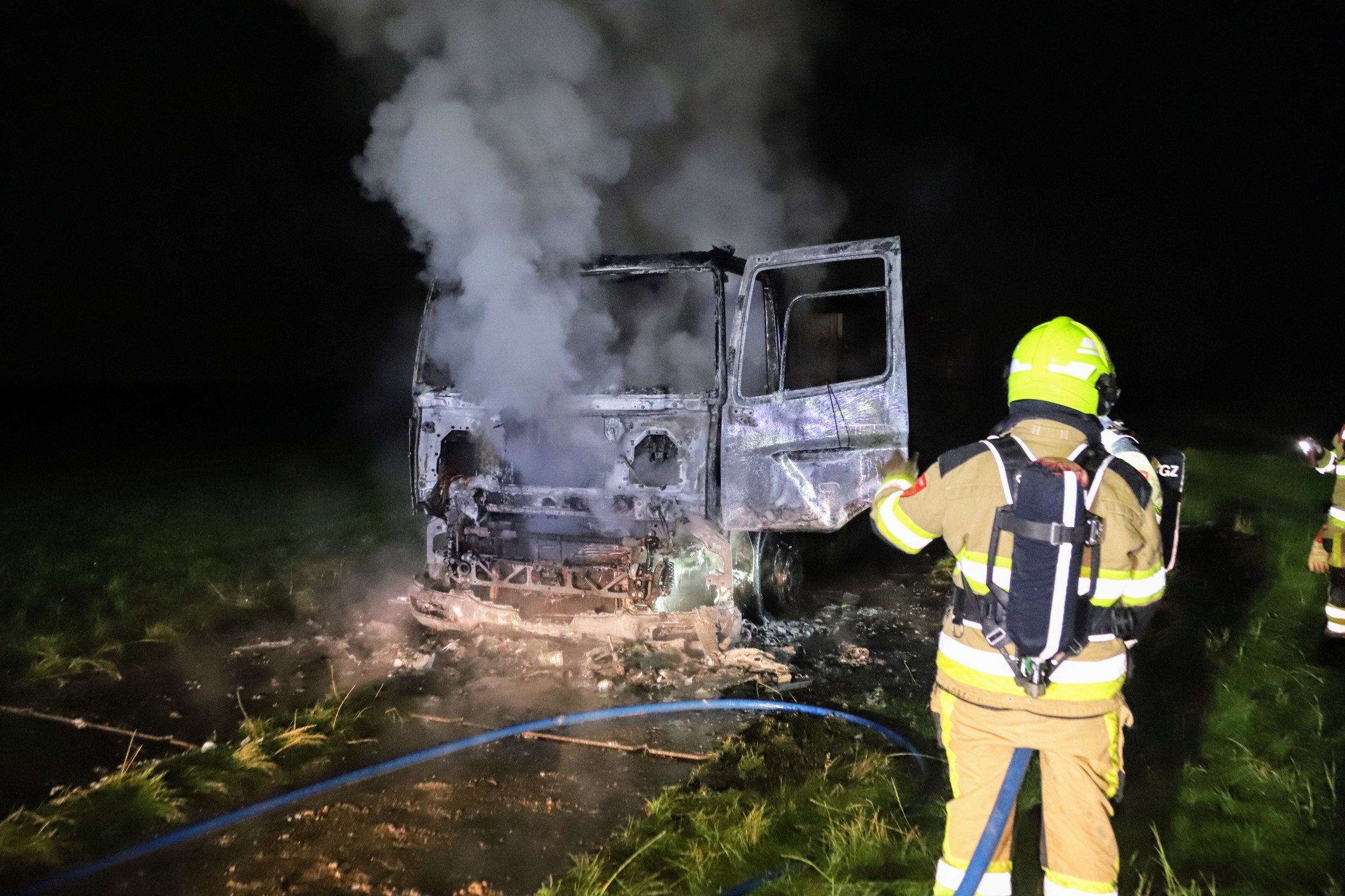 In een weiland stond een vrachtwagen met een hydraulische kraan geparkeerd, waarvan de cabine volledig in brand stond. De brandweer van Geldermalsen heeft de brand geblust. Er zal sporenonderzoek worden verricht naar de oorzaak.