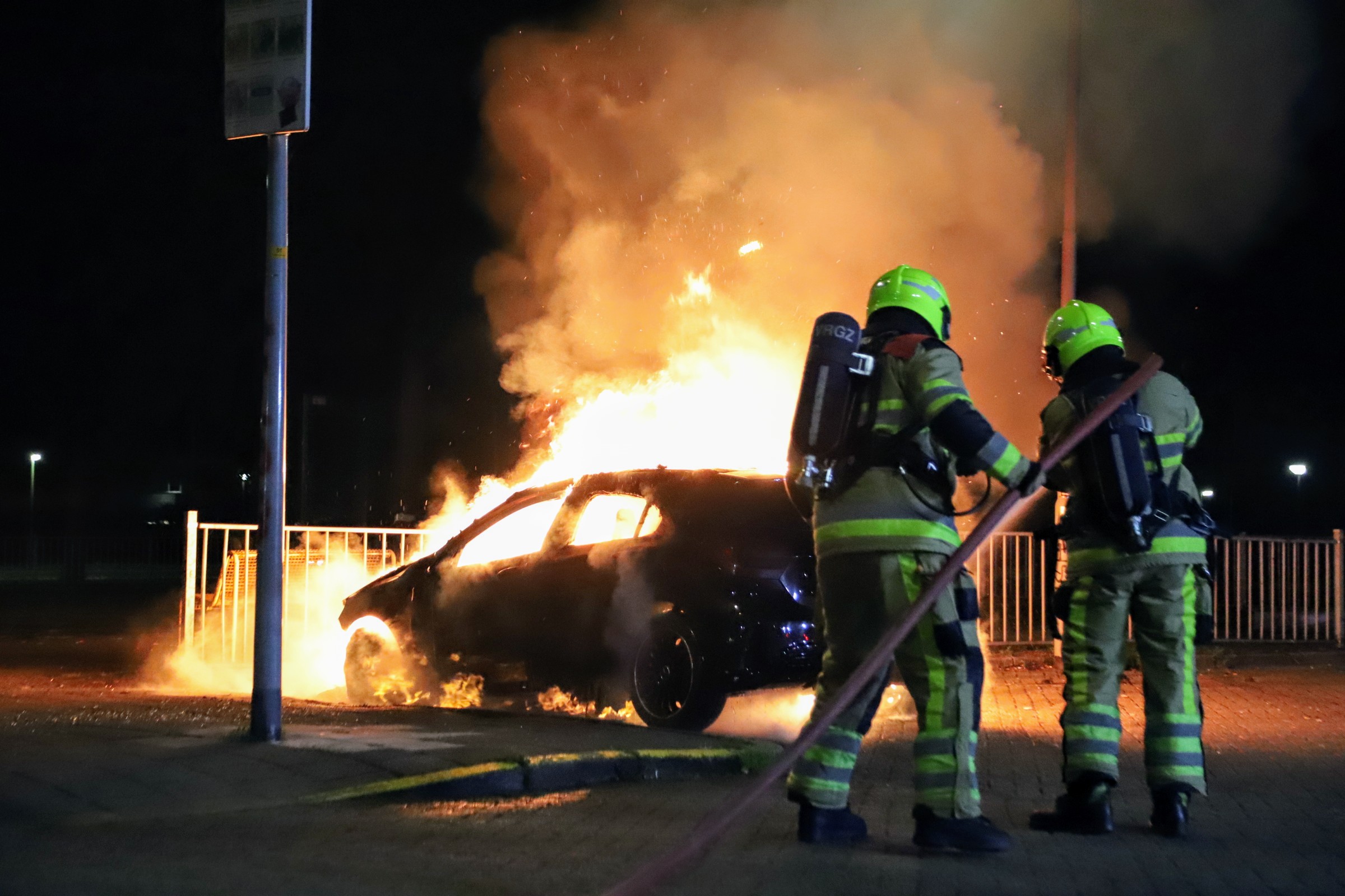 Bij aankomst van de brandweer bleek een personenauto volledig in brand te staan op het parkeerterrein achter de sporthal aan de Predikbroedersweg. Het voertuig brandde volledig uit. De politie kwam met meerdere voertuigen ter plaatse in verband met eerdere branden een dag eerder. Hierbij gingen verschillende materialen in vlammen op, waaronder autobanden.