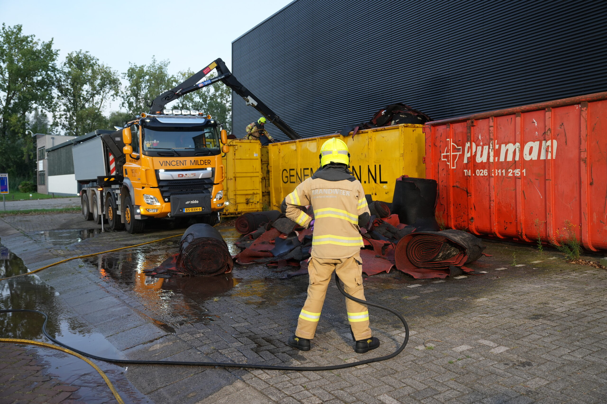 Een kraan is opgeroepen om de container leeg te maken, zodat de brandweer de resterende brandhaarden goed kan doven.
