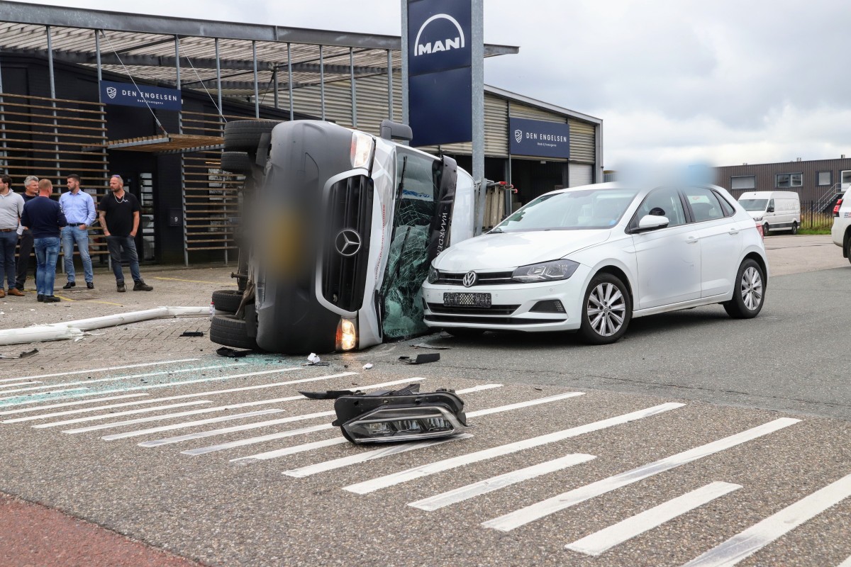 Bestelbus op z’n kant na botsing, twee gewonden naar ziekenhuis