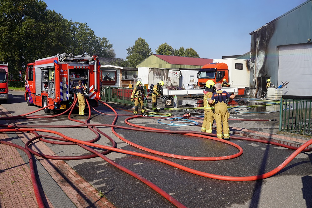 De brandweer is druk bezig het vuur te blussen en heeft enkele gasflessen in veiligheid gebracht en gekoeld. Om de brand beter te kunnen bereiken, moesten gaten in het dak worden gezaagd.