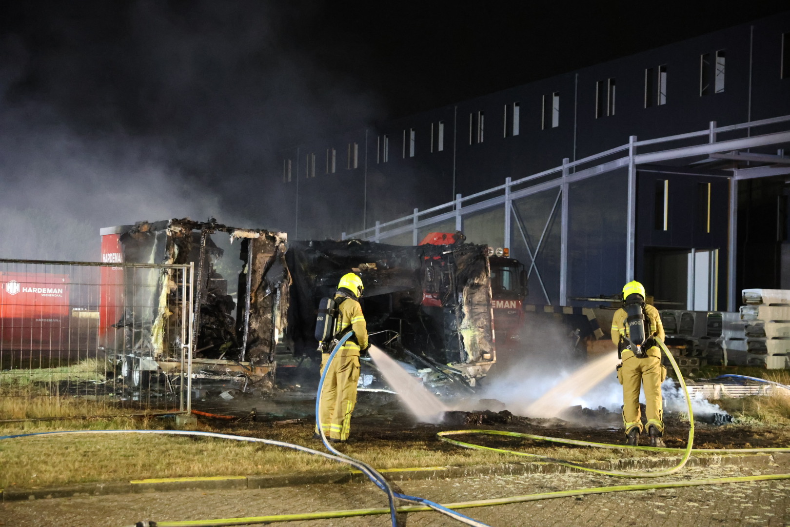 Twee bouwketen van het bedrijf Hardeman uit Veenendaal gingen wij de brand volledig verloren. Om bij de brand te komen moest de brandweer een slagboom van een bedrijf forceren.