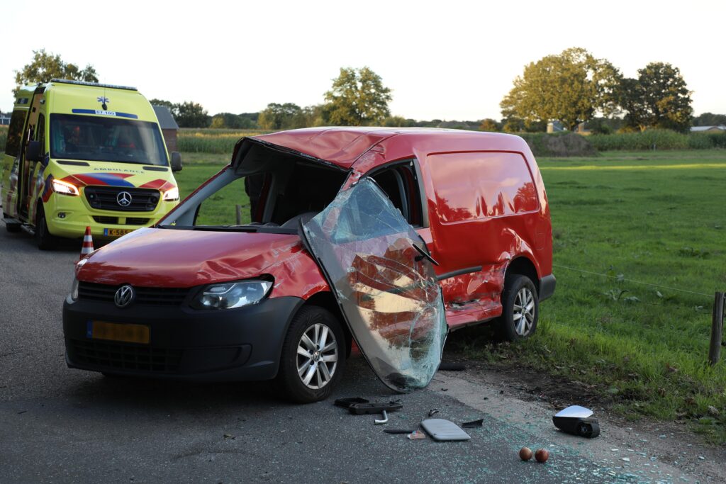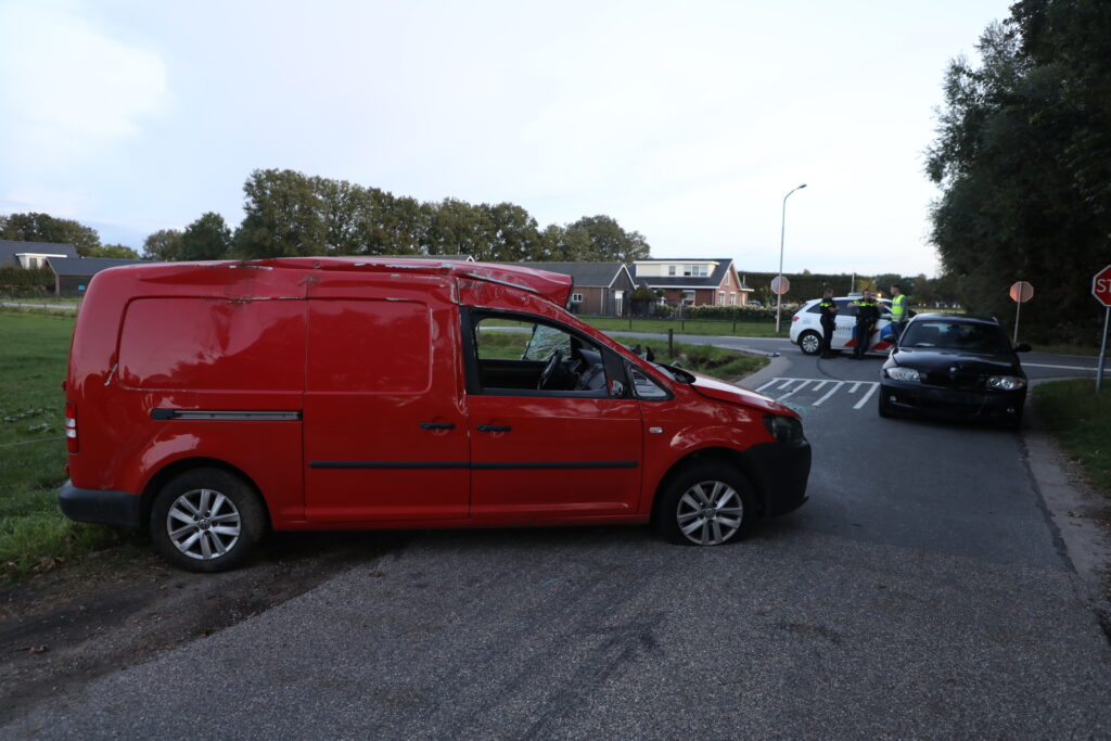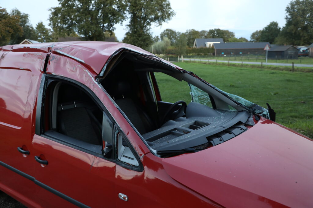 Rond 19:00 uur botsten twee auto’s door een voorrangsfout hard op elkaar. Een van de voertuigen, een bestelwagen, kwam door de klap op zijn kop terecht.