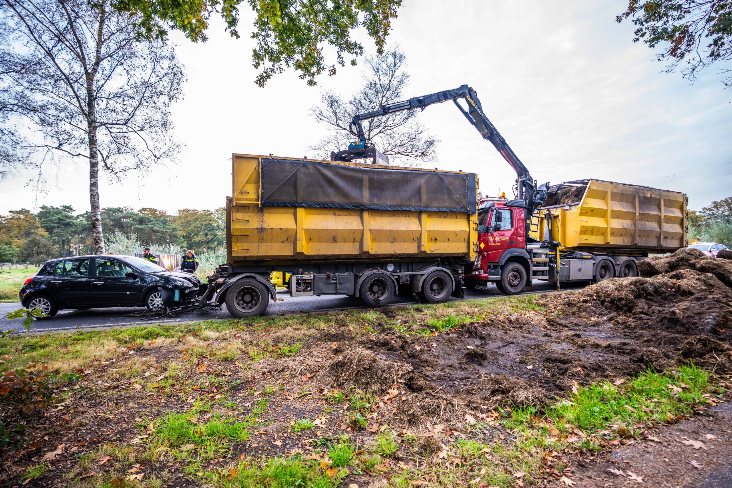 Het ongeluk vond plaats kort voor 08.00 uur. De vrachtwagen en trailer stonden stil op de weg, vermoedelijk in verband met werkzaamheden om gemaaid gras op te ruimen.