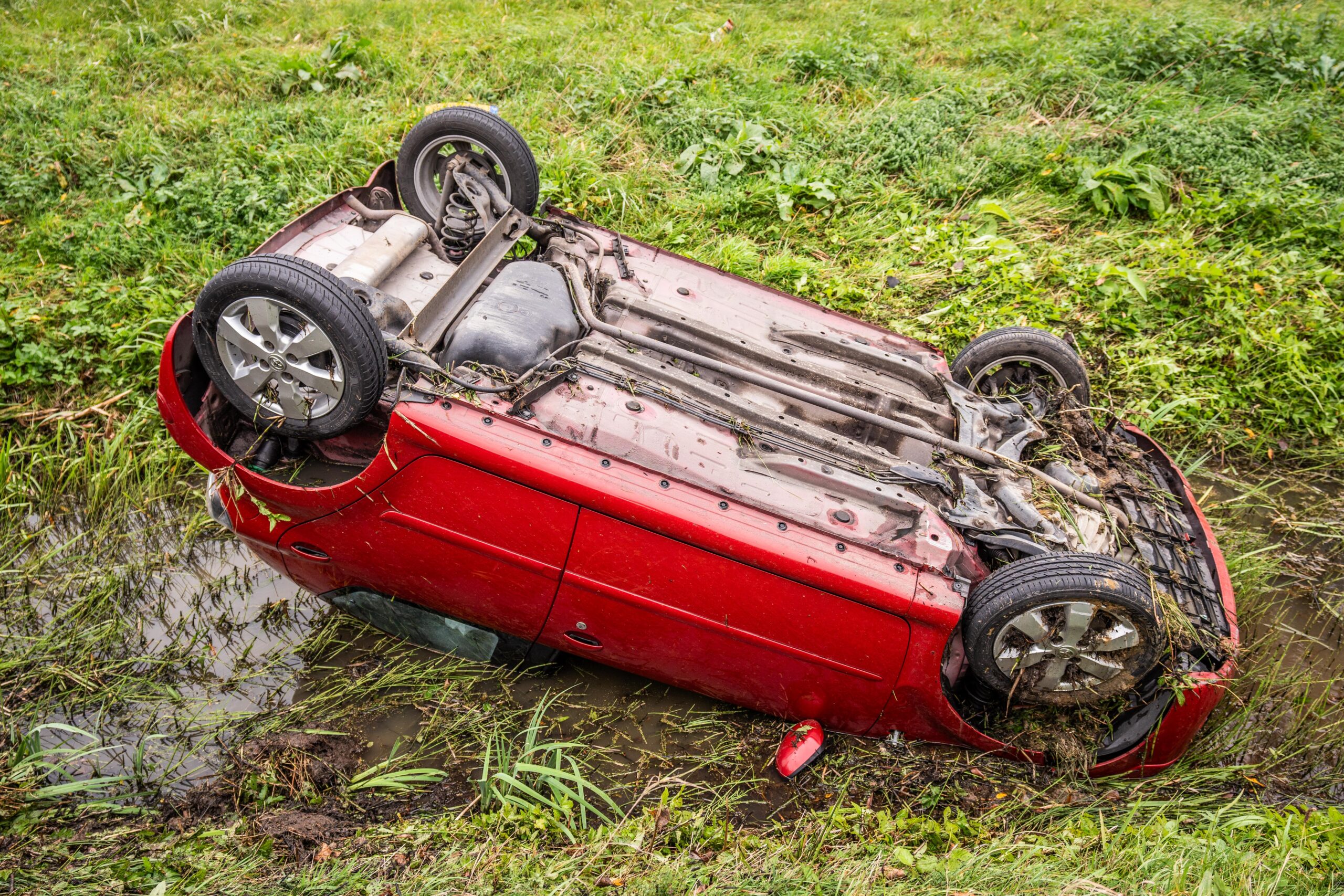 Automobilist schikt van ooievaar, auto op z’n kop in sloot