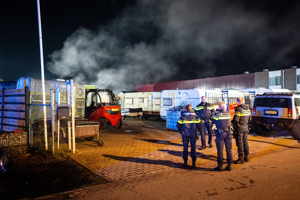Op het terrein, waar diverse goederen lagen opgeslagen, stonden twee auto’s, een boot en een caravan in brand. De schade is aanzienlijk.