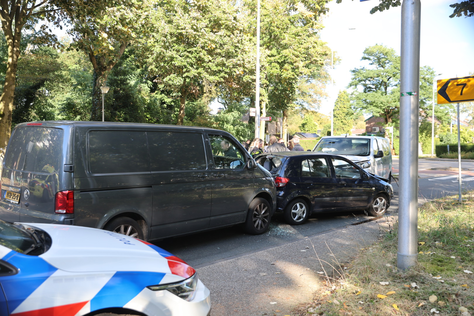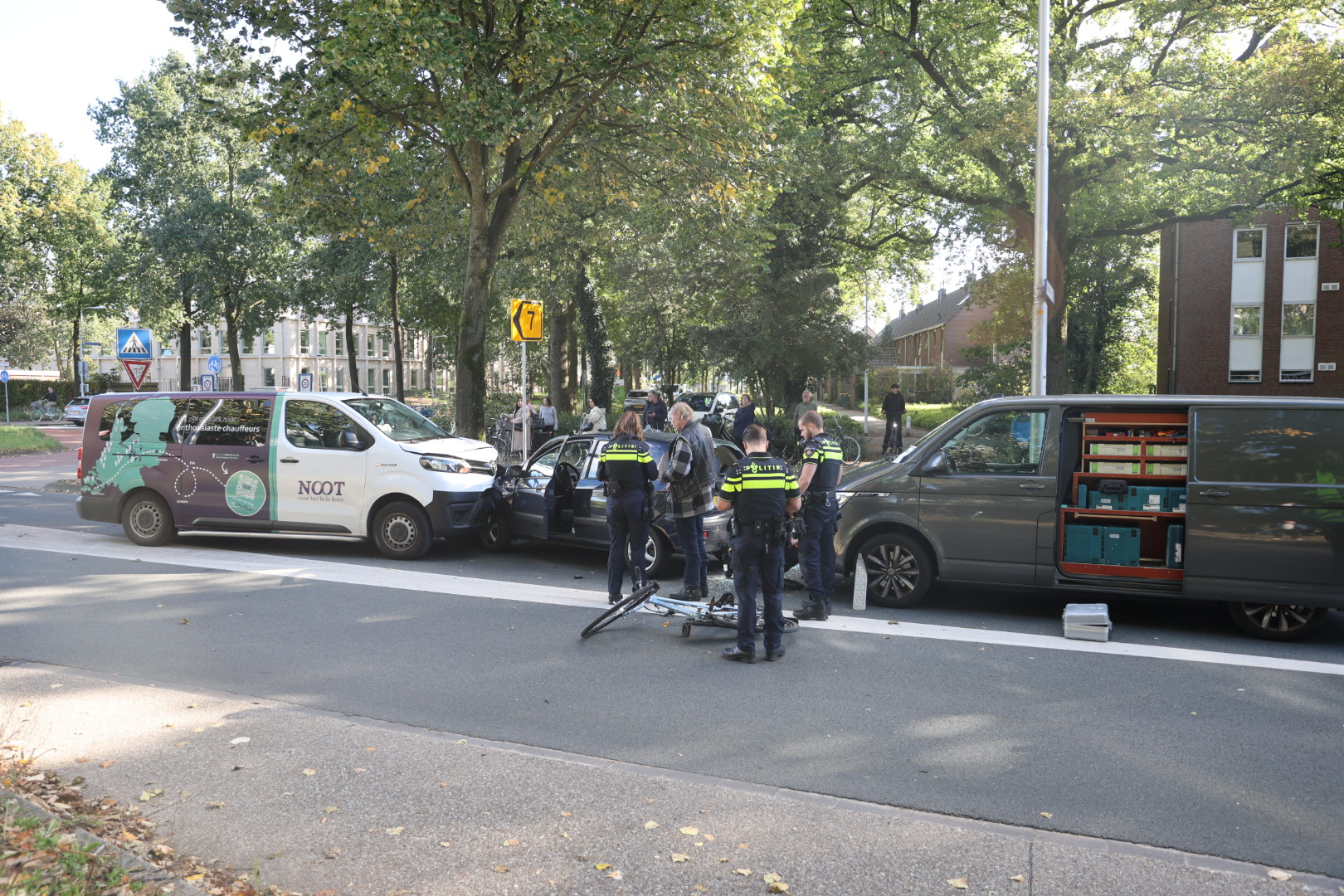 Veel schade na botsing tussen drie voertuigen en een fietser