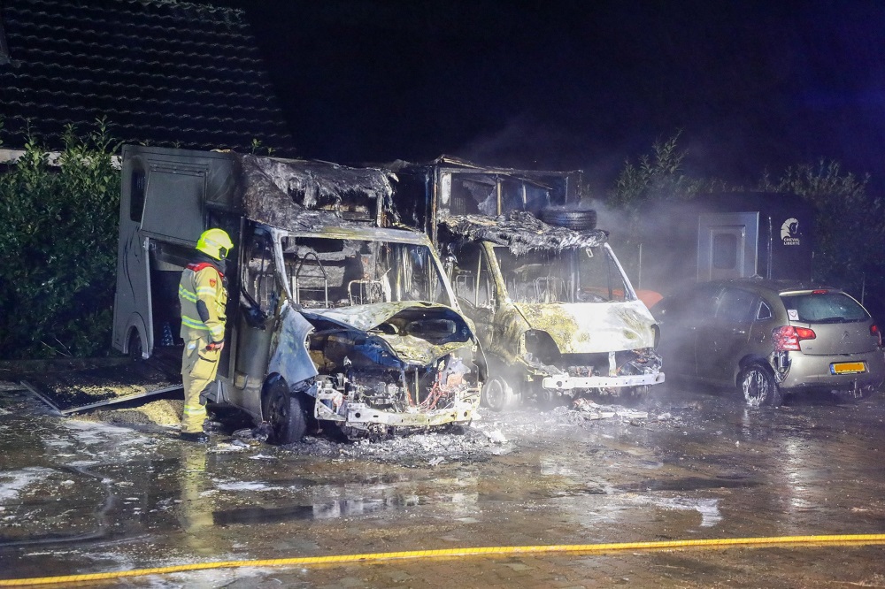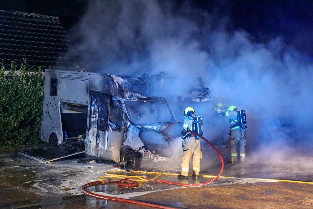 De brandweer kwam snel ter plaatse en wist overslag naar de schuur te voorkomen. Twee paardenwagens en een personenauto zijn volledig verloren gegaan.