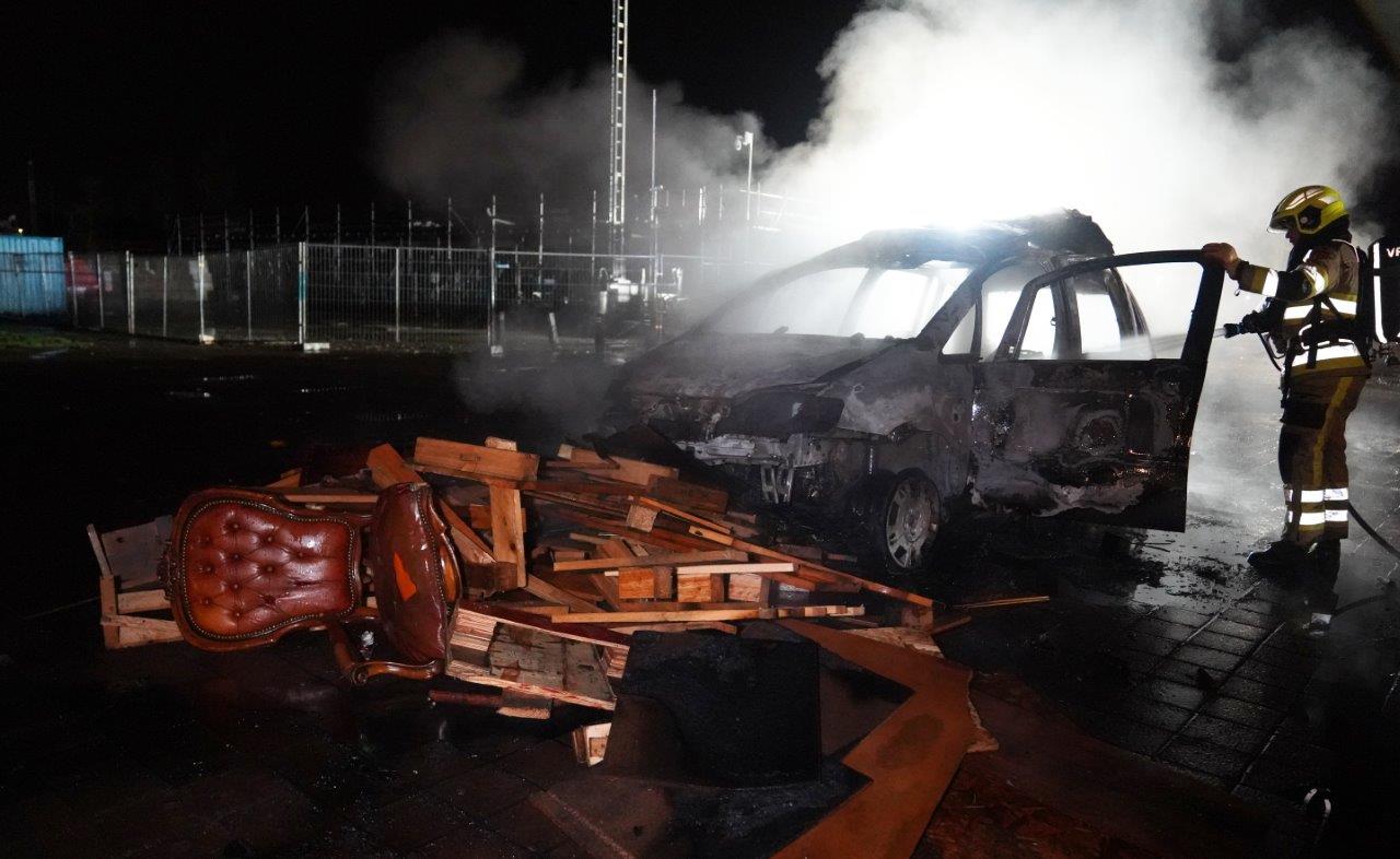 Rond middernacht ontving de brandweer een melding van een autobrand. Bij aankomst stond een vermoedelijke sloopauto volledig in brand tegen een grote stapel hout. Rondom lagen dozen met vuurwerk, waarvan één nog grotendeels vol was. De brandweer bluste de brand met ondersteuning van een waterwagen.