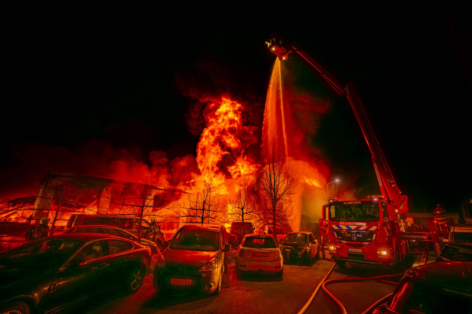NIJMEGEN – Dinsdagavond rond 21.45 uur is een grote brand uitgebroken aan de Vlotkampweg in Nijmegen. Het vuur woedde in een bedrijfsverzamelgebouw op het industrieterrein aan de Westkanaaldijk, vermoedelijk bij een garagebedrijf. De brandweer schaalde snel op naar ‘zeer grote brand’ en zette acht blusvoertuigen en drie hoogwerkers in om de vlammen te bestrijden.