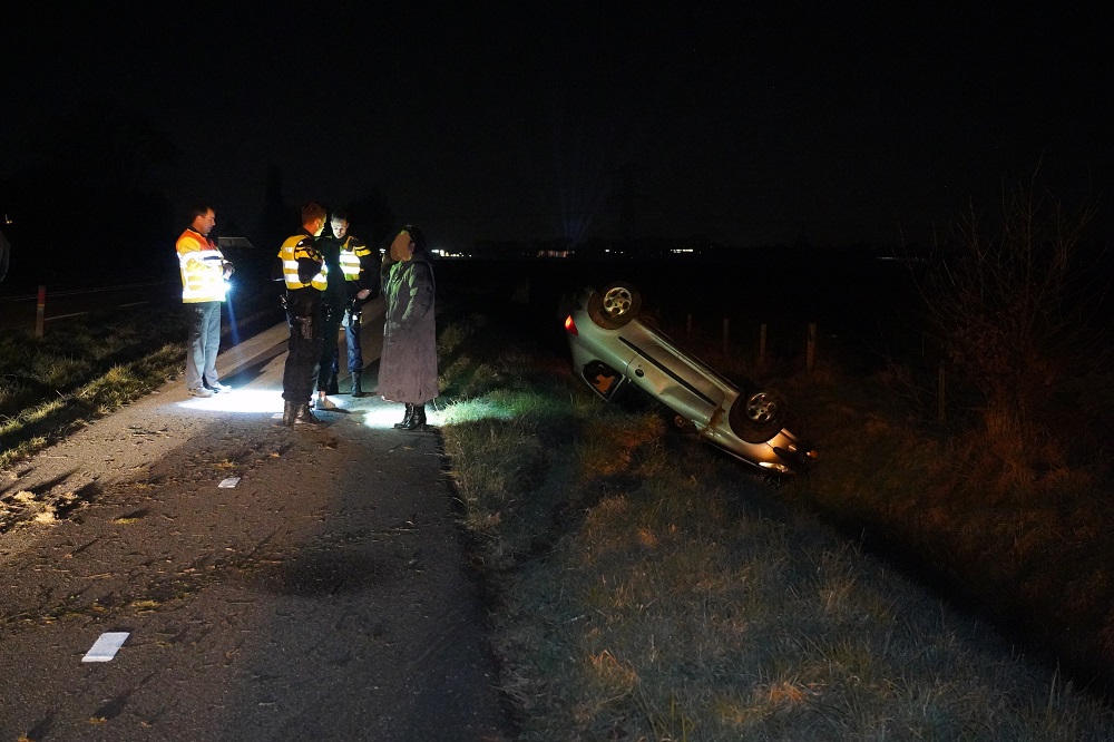 ZEVENAAR – Zondagavond rond 23:20 uur is een auto op de Doesburgseweg (N336) in Zevenaar ondersteboven in een sloot beland na een uitwijkmanoeuvre voor een dier.