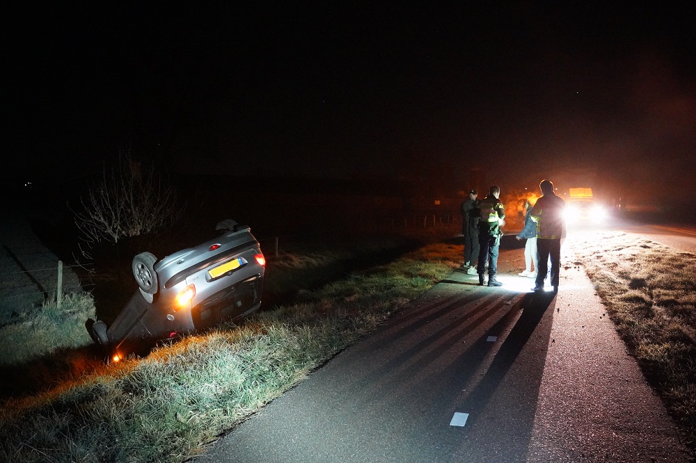 Auto raakt van de weg en belandt op z’n kop in sloot