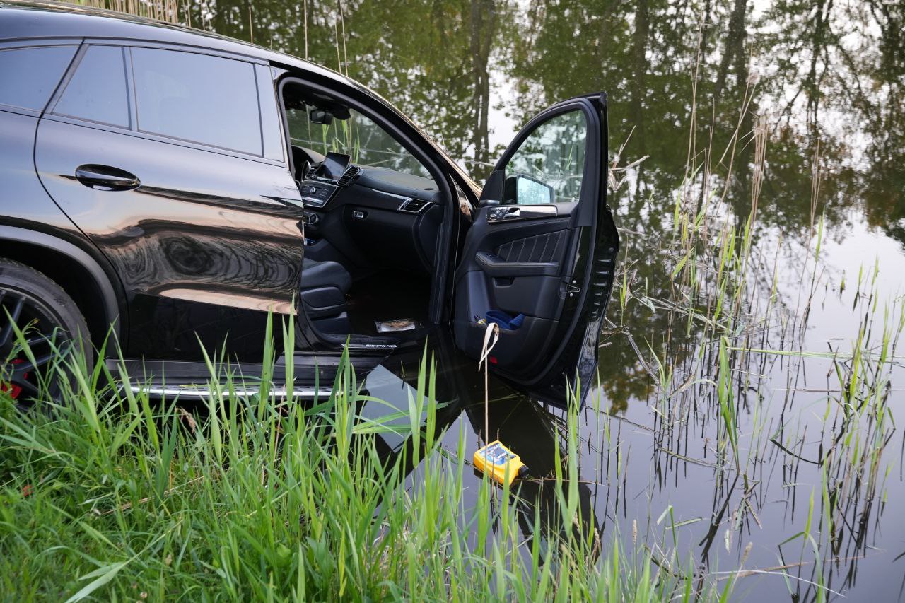 De bestuurder van een Mercedes AMG, die vanaf de Broeklanderweg kwam, verloor rond dat moment een wiel en raakte daardoor van de weg. Het voertuig kwam met de neus in het water terecht. De bestuurder bleef bij het incident ongedeerd.