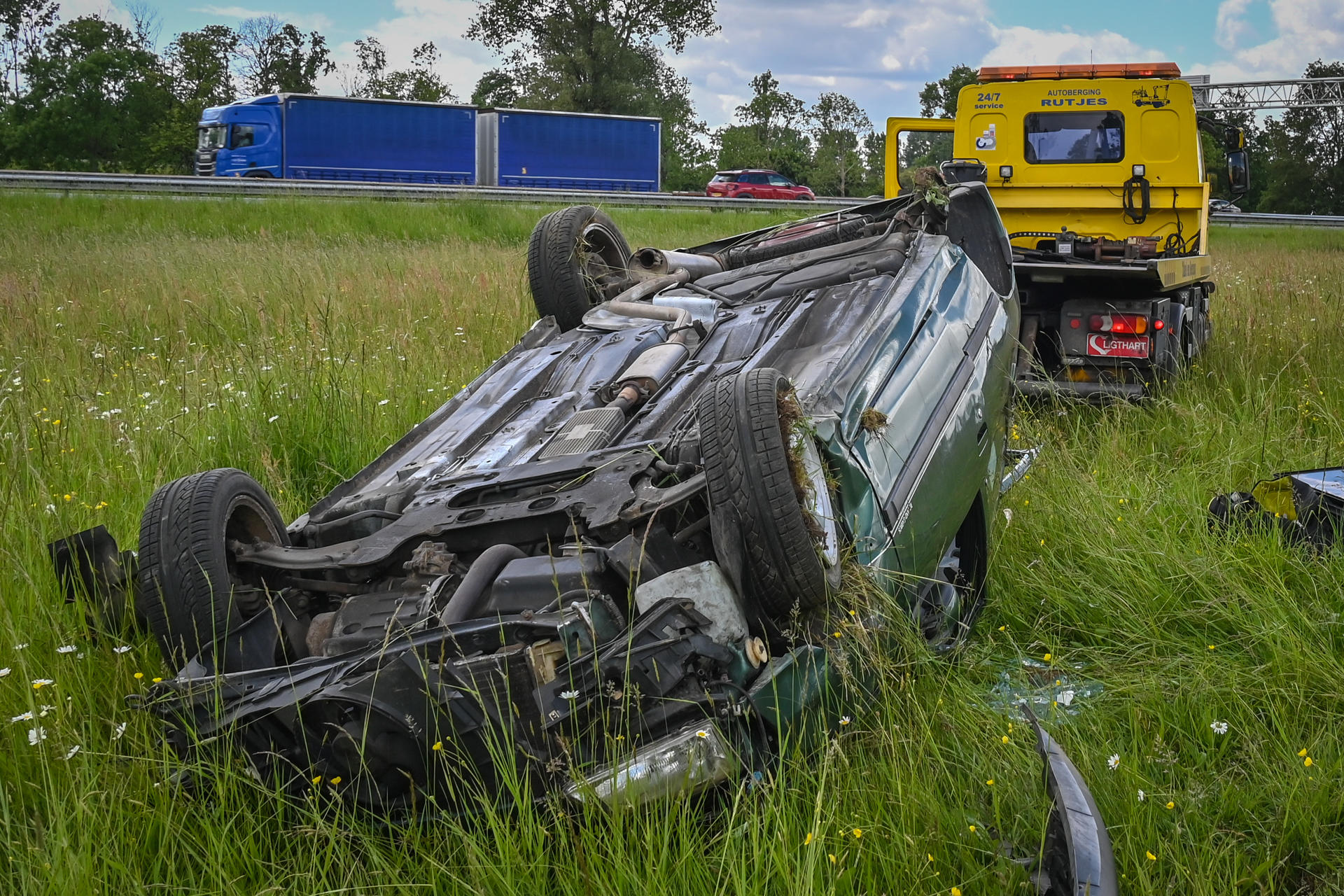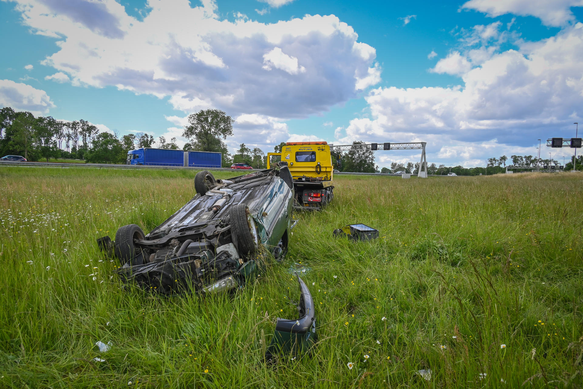 Een bergingsbedrijf is ingeschakeld om het voertuig en verspreide onderdelen op te ruimen. Het ongeval trekt de aandacht van passerende automobilisten, wat heeft geleid tot een file vanaf de afslag Didam. De oorzaak van het incident is nog niet bekend.