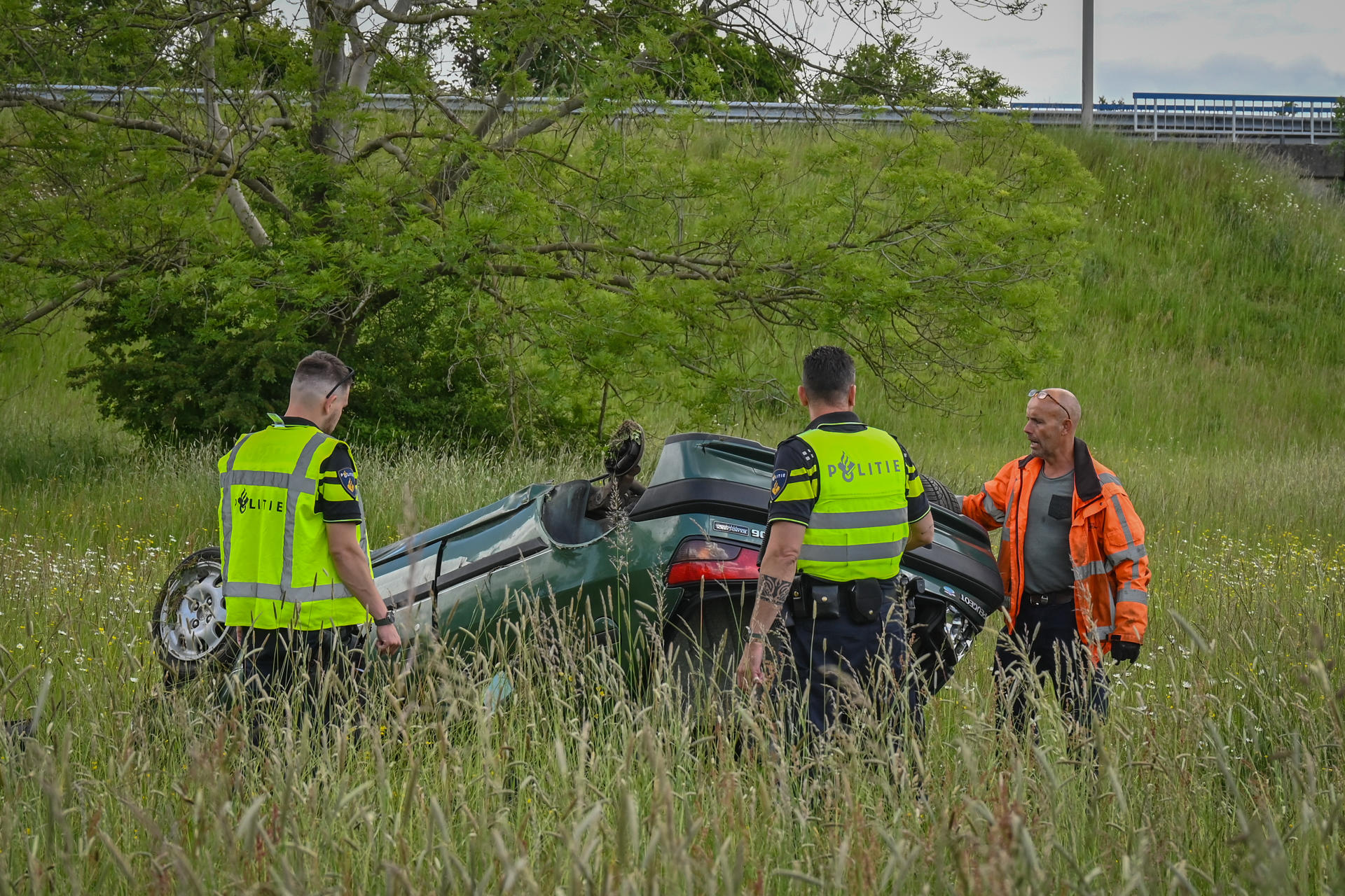 Auto slaat over de kop na bocht bij knooppunt, bestuurder naar ziekenhuis