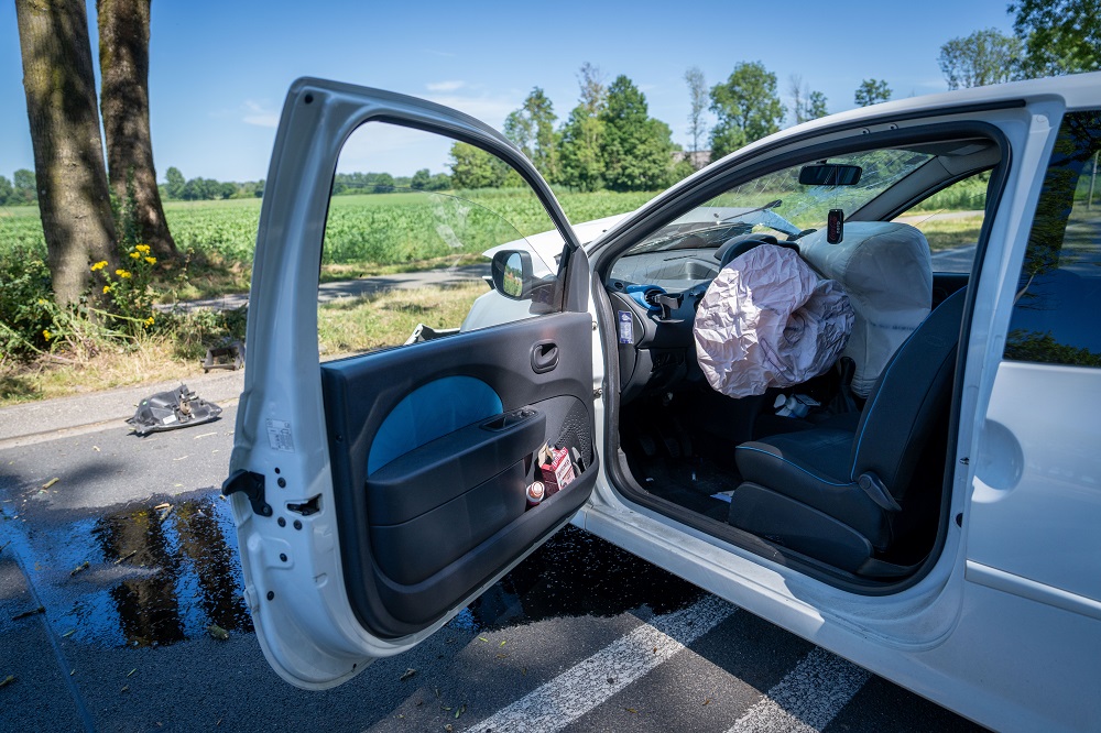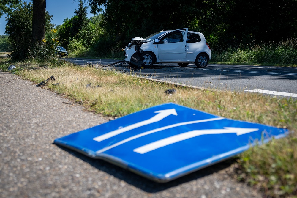 De auto kwam door nog onbekende oorzaak met volle snelheid in de berm terecht, reed een verkeersbord omver en botste vervolgens tegen een boom. Door de klap schoot het voertuig weer terug het wegdek op.