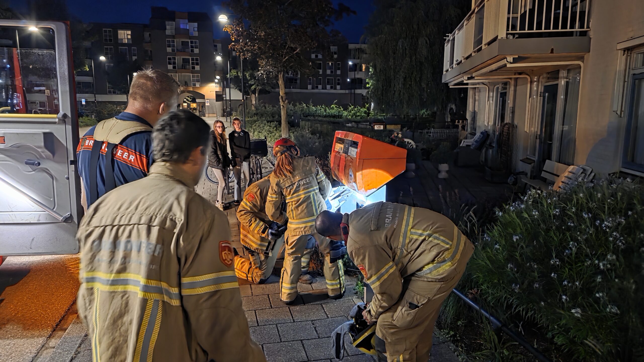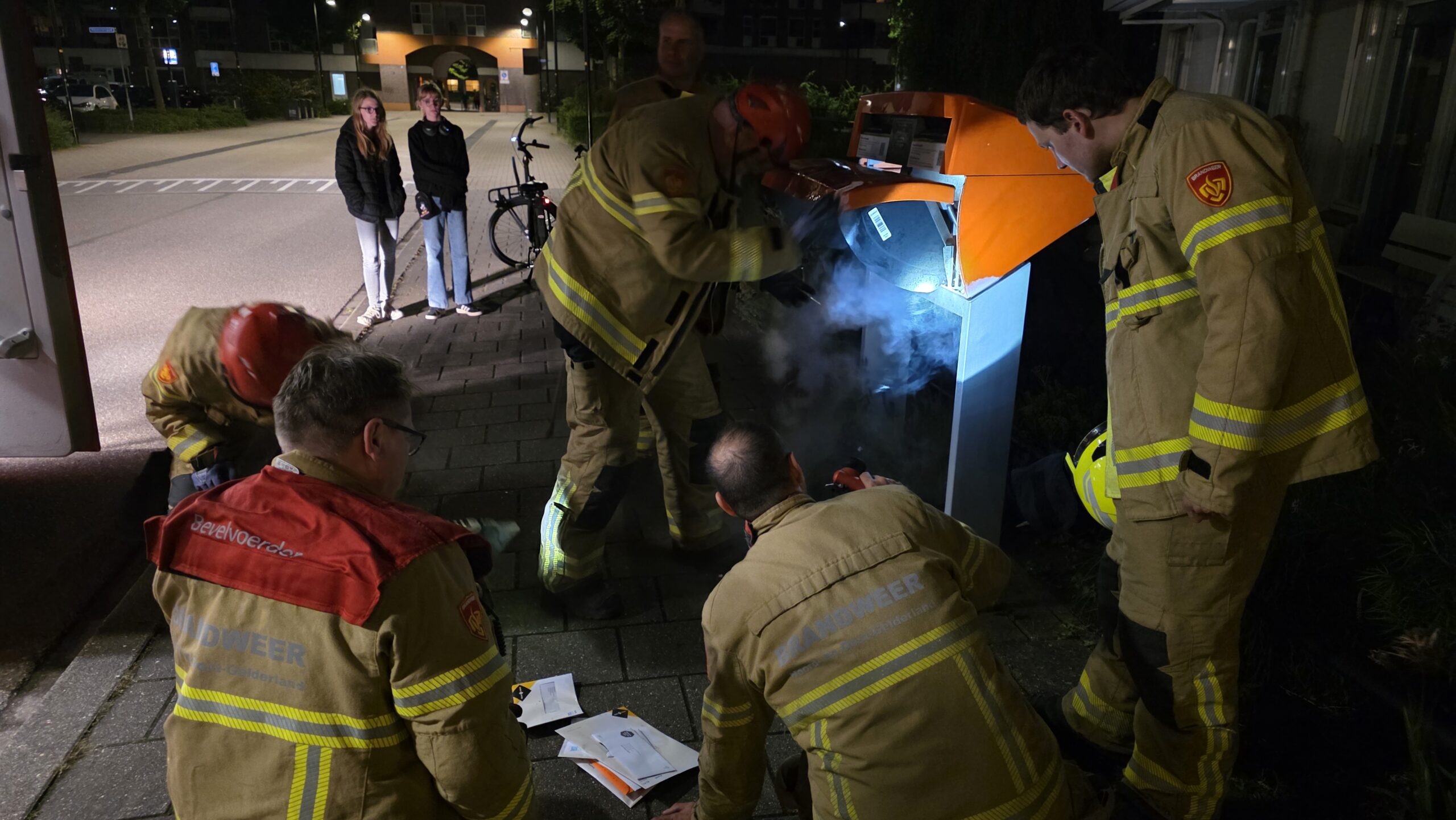 Brievenbus in brand, jonge meiden bellen brandweer