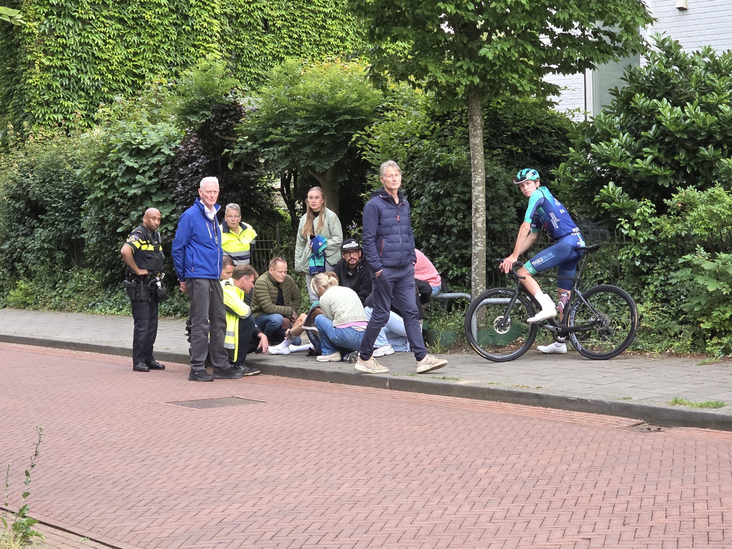 De renner kwam vermoedelijk ten val nadat hij de stoeprand raakte. Hij werd ter plaatse nagekeken in de ambulance. Of hij is overgebracht naar het ziekenhuis, is niet bekend.