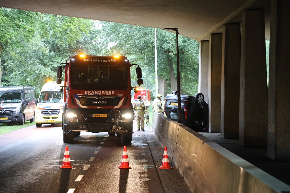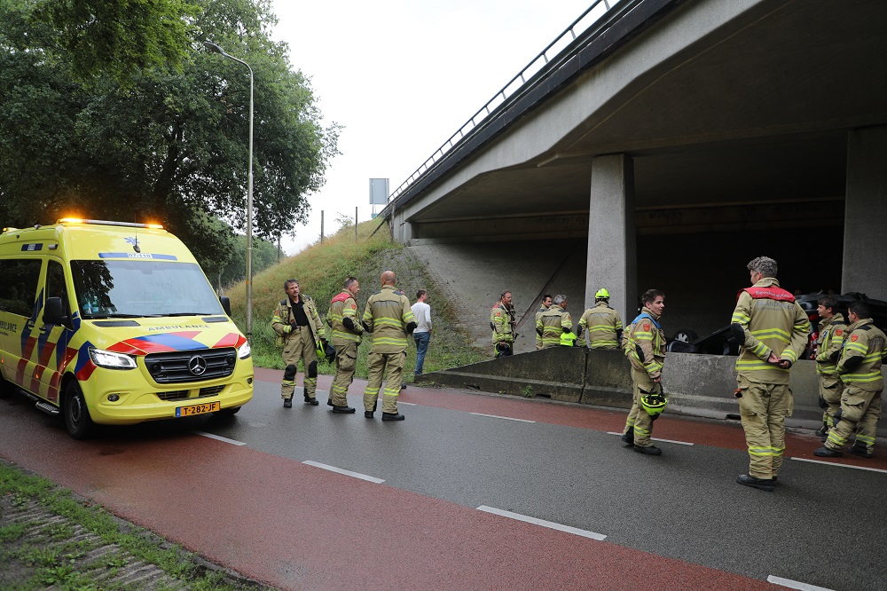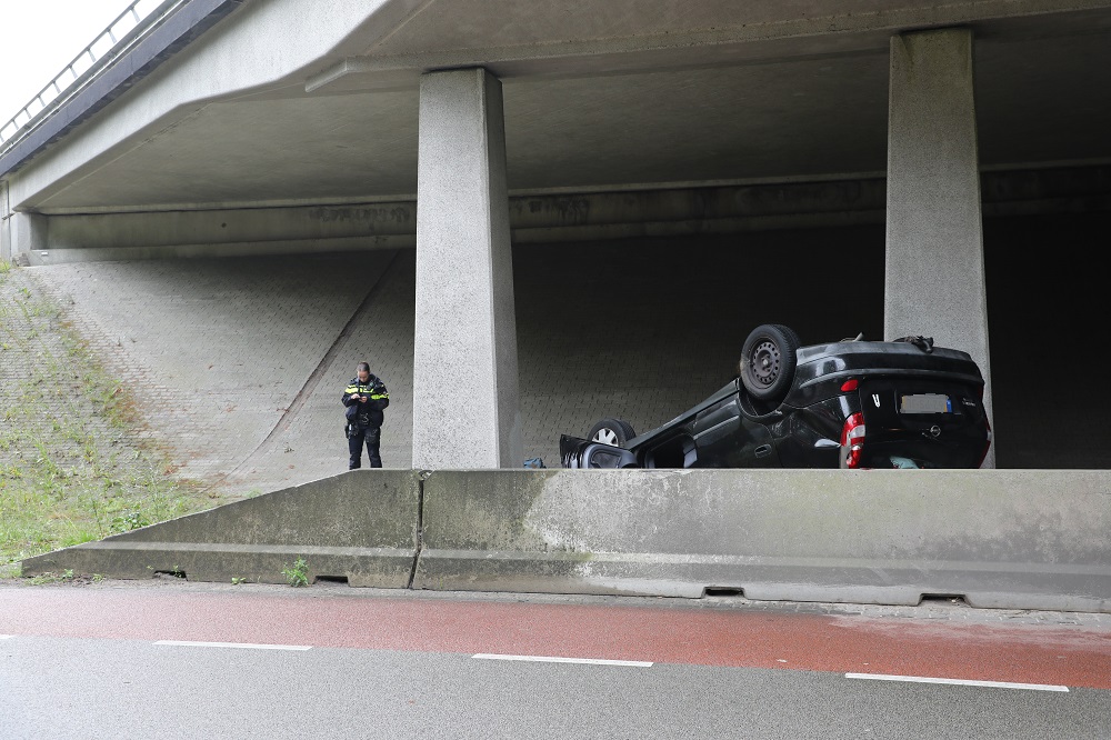 Auto slaat over de kop en belandt tussen pilaren van viaduct