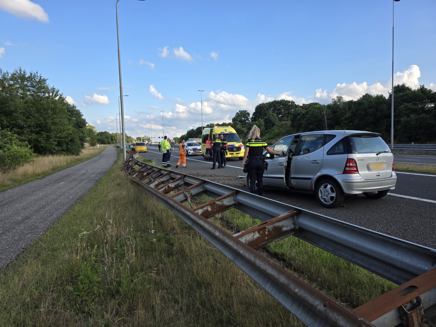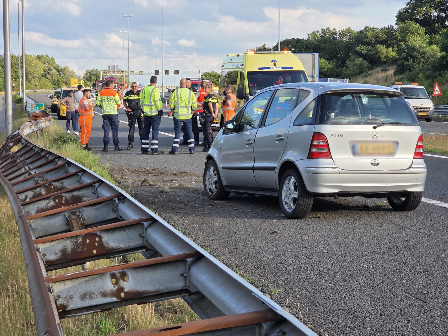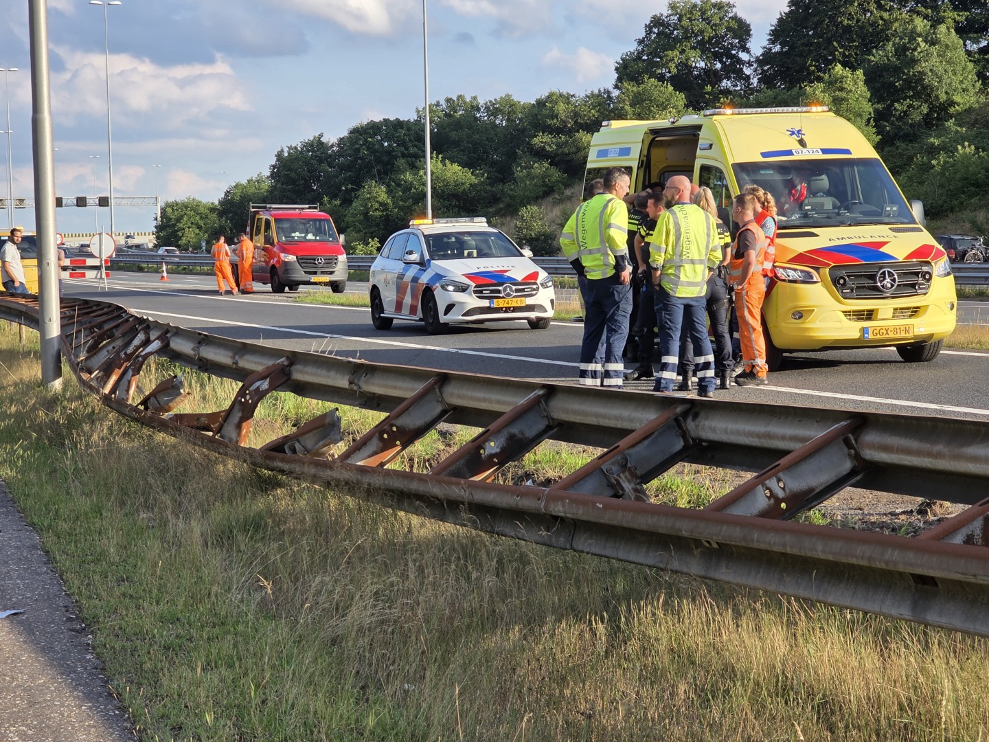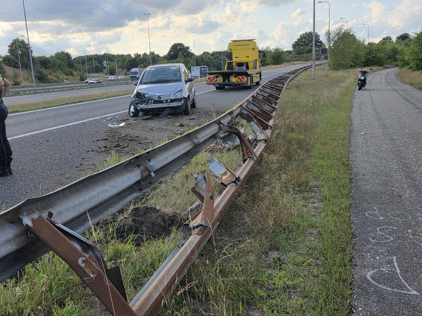 Het incident vond plaats op de afrit, waarbij brokstukken verspreid raakten over zowel de rijbaan als het naastgelegen fietspad. De auto en de vangrail raakten zwaar beschadigd. De bestuurder is in de ambulance onderzocht, maar hoefde niet naar het ziekenhuis.