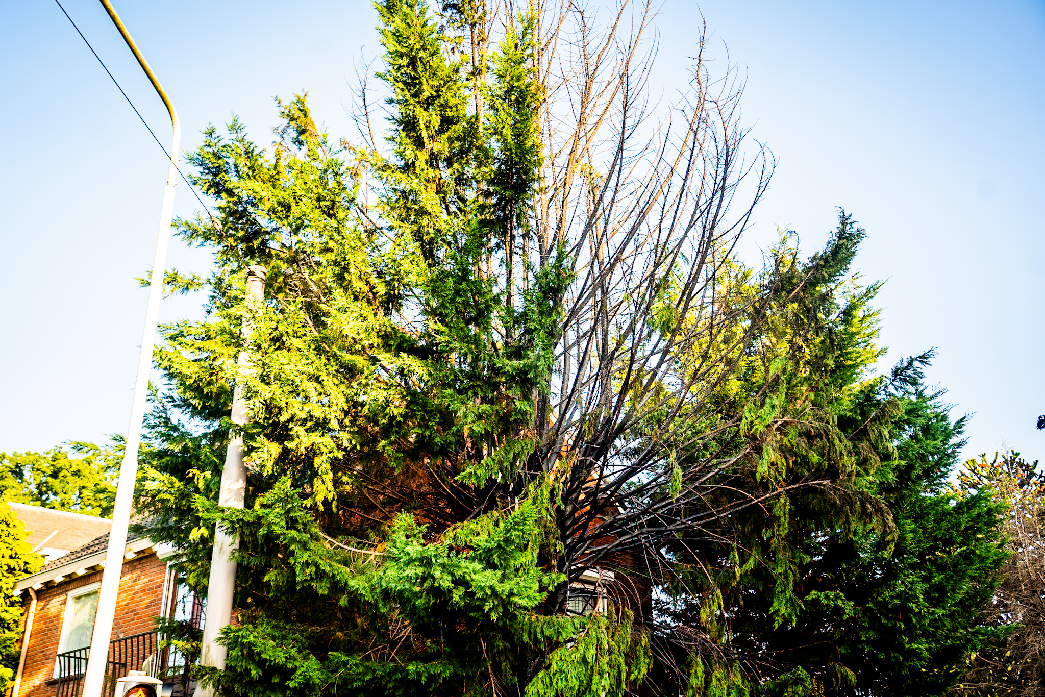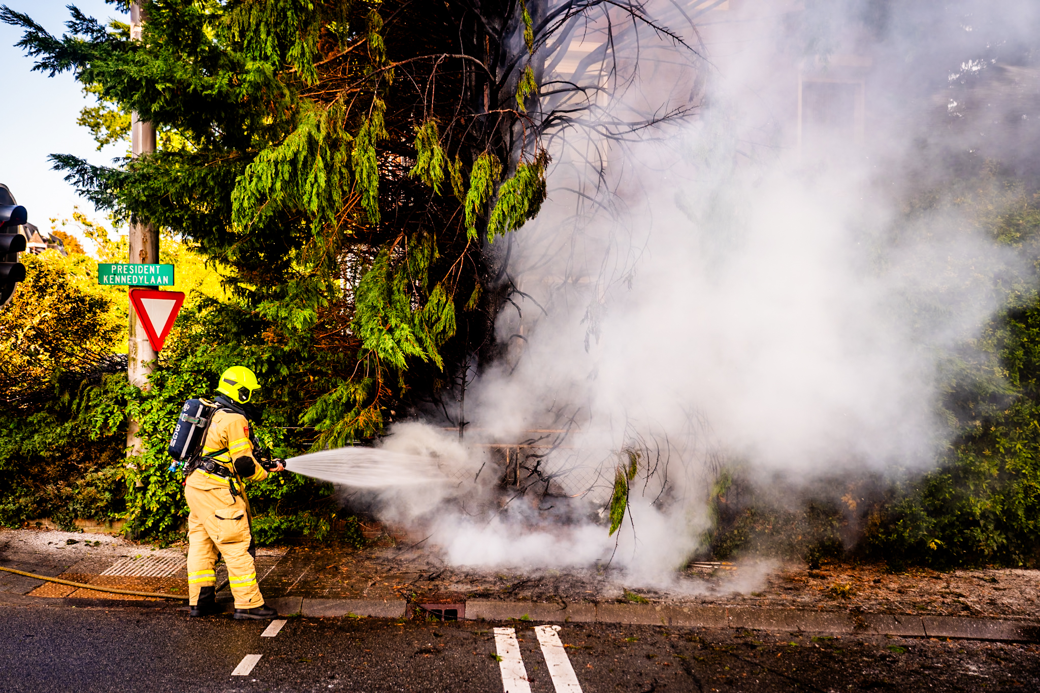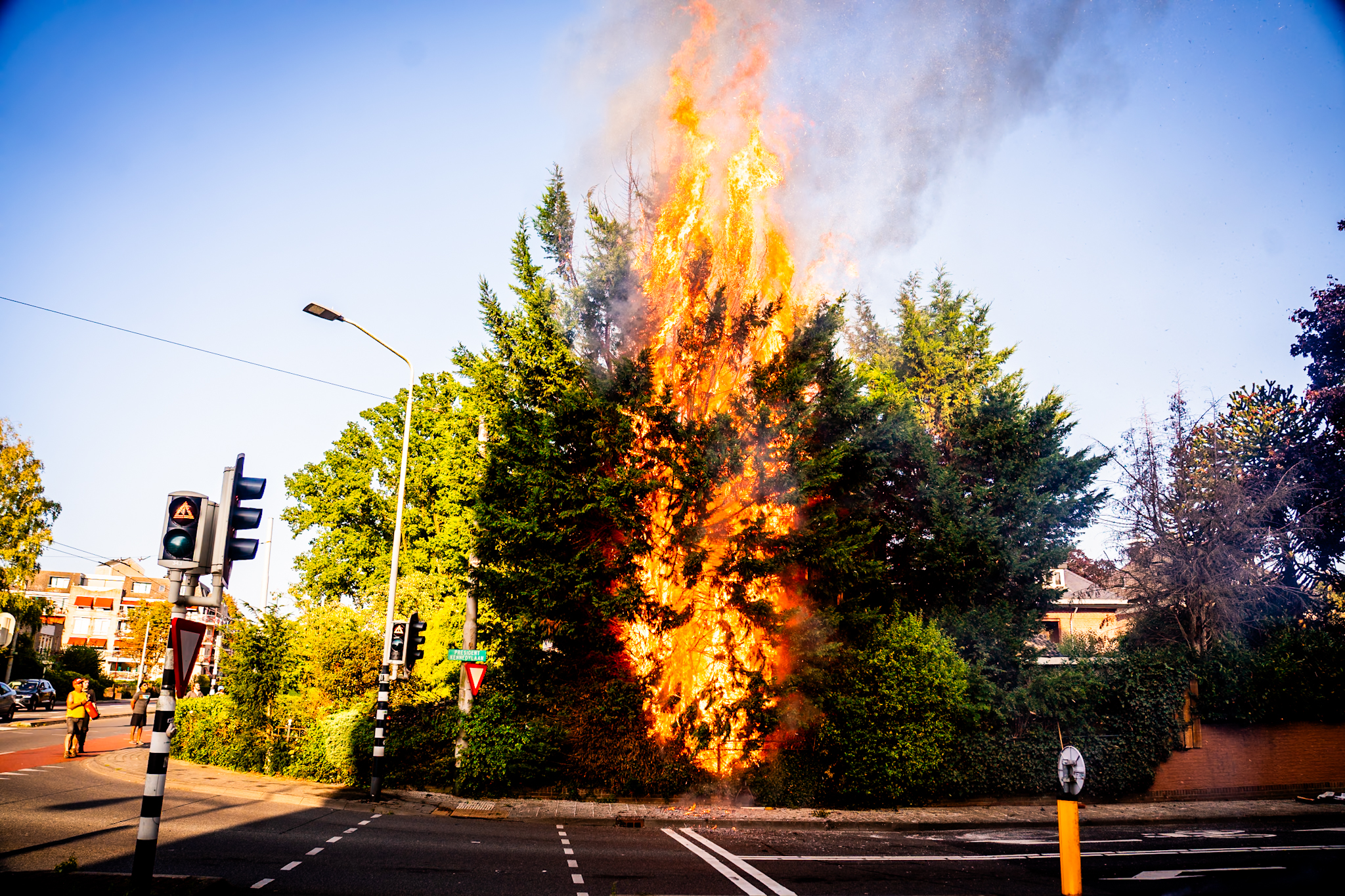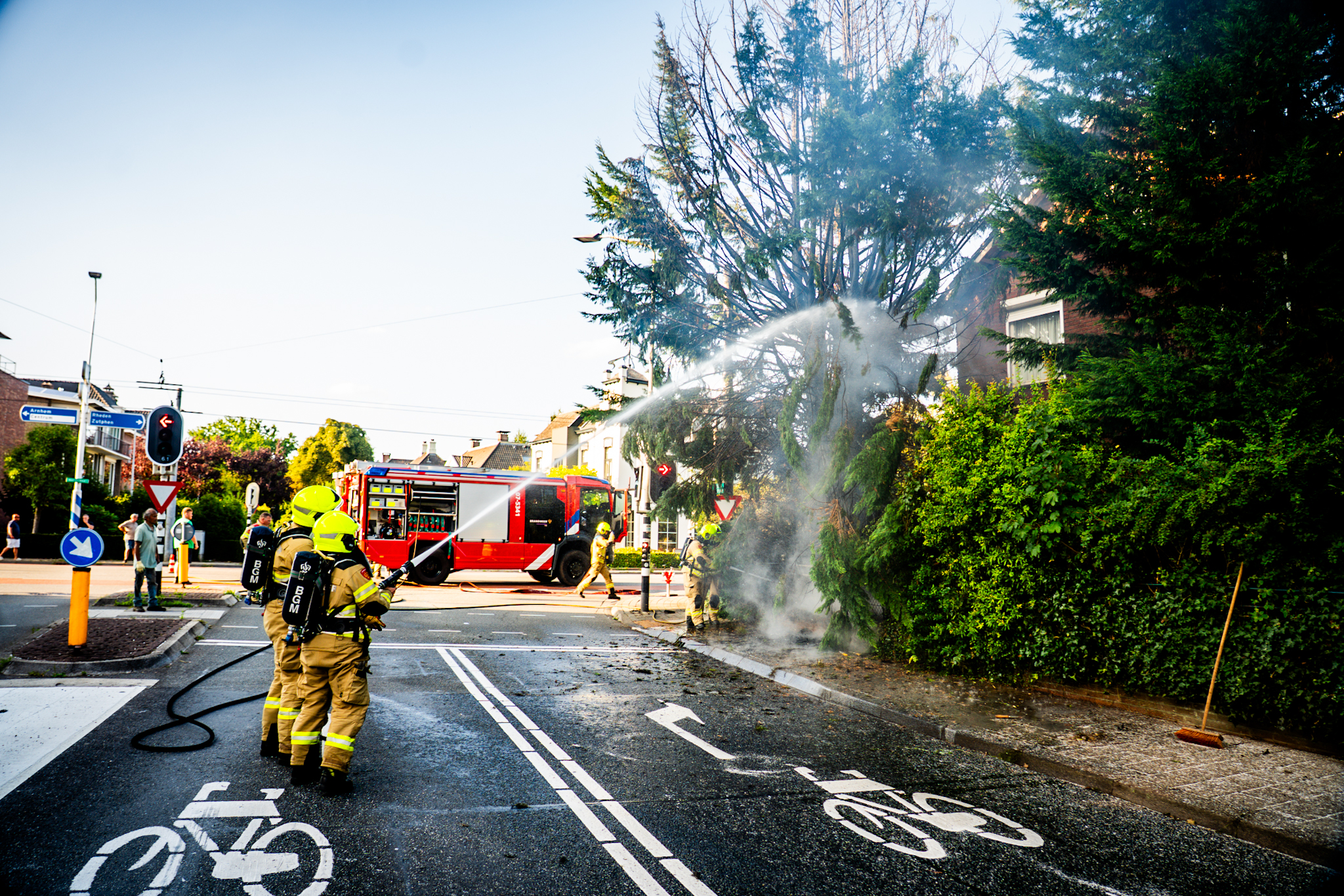 De brandweer was snel ter plaatse en wist het vuur te blussen. De coniferenboom is vrijwel volledig uitgebrand en zal binnenkort worden verwijderd. Er raakte niemand gewond.