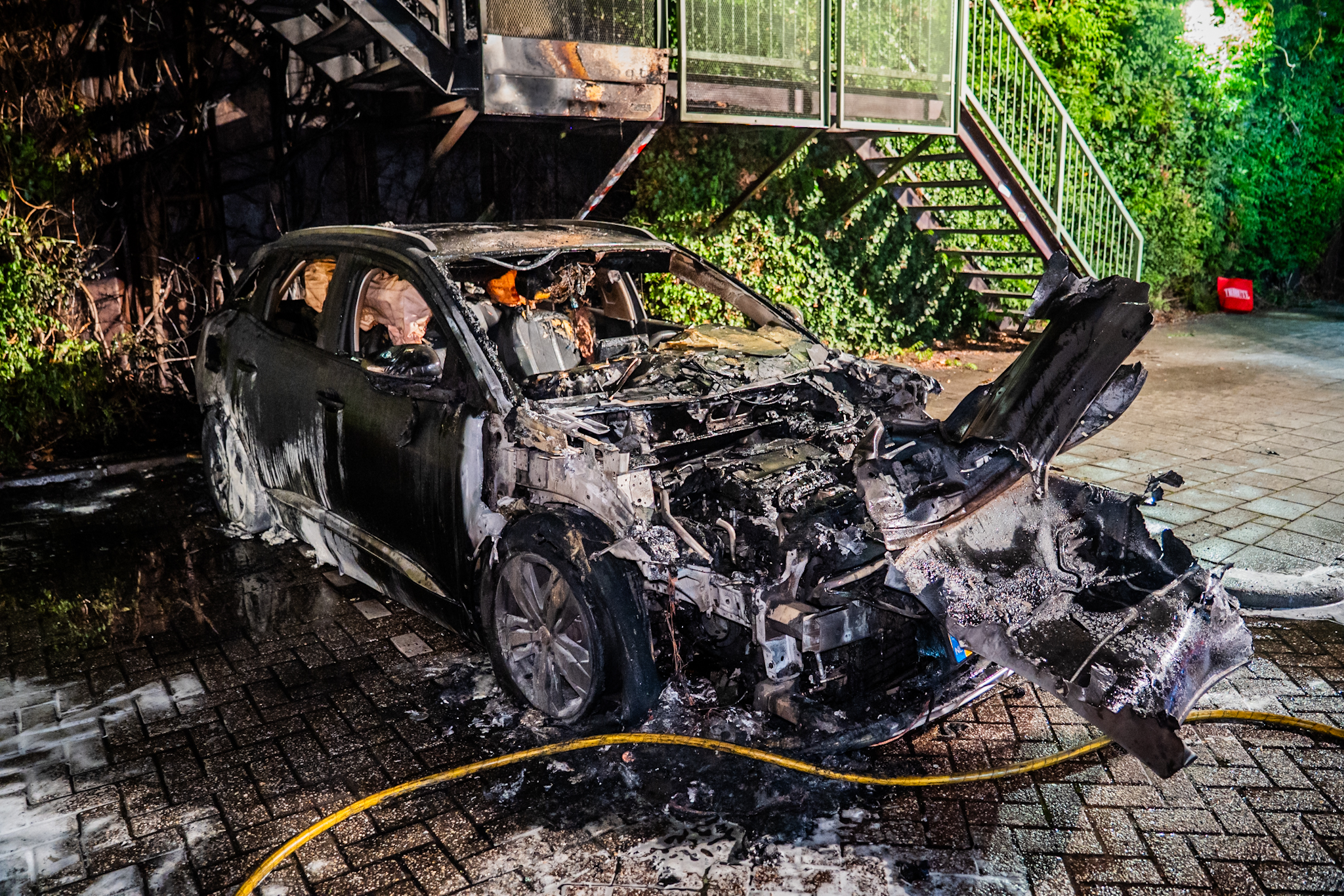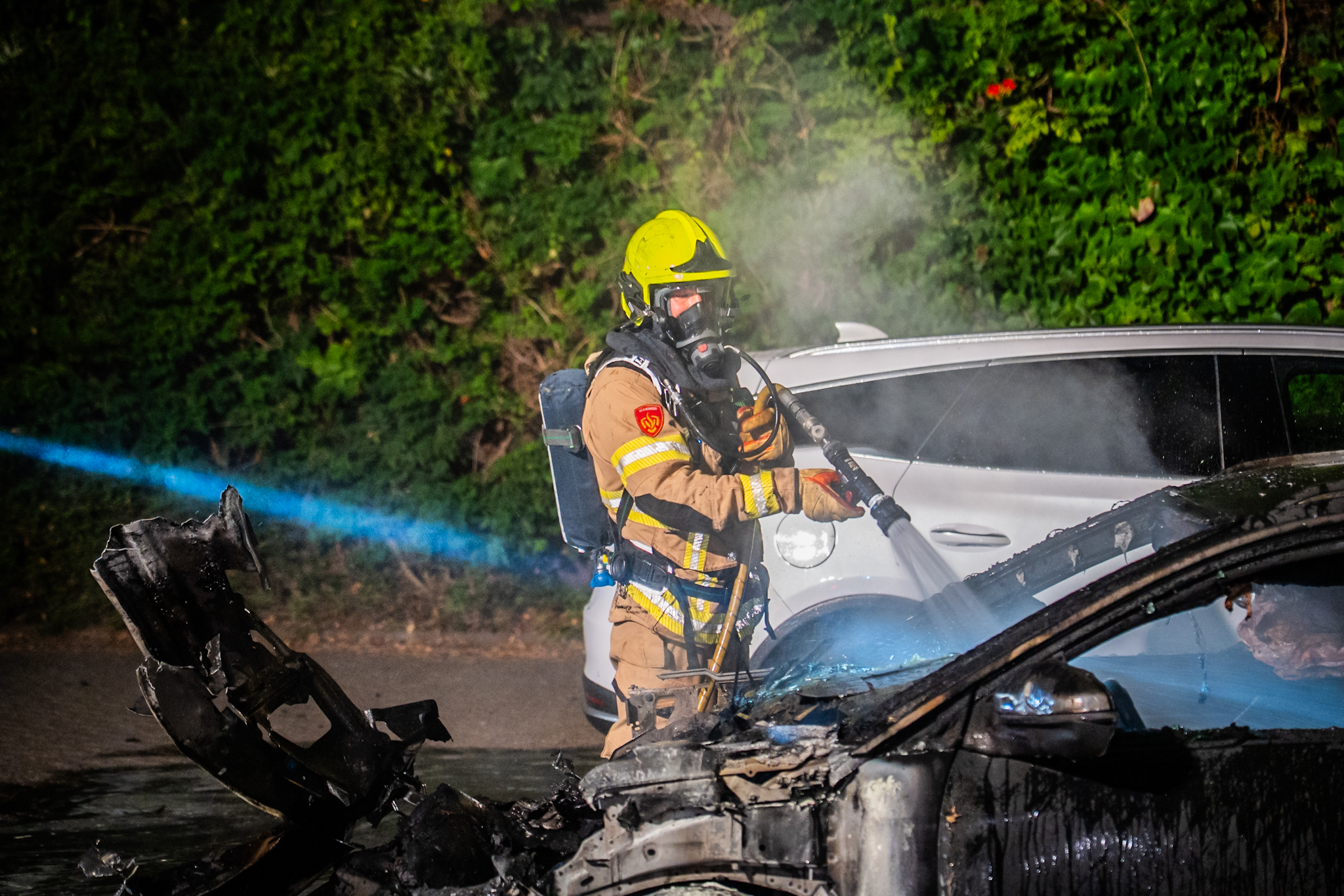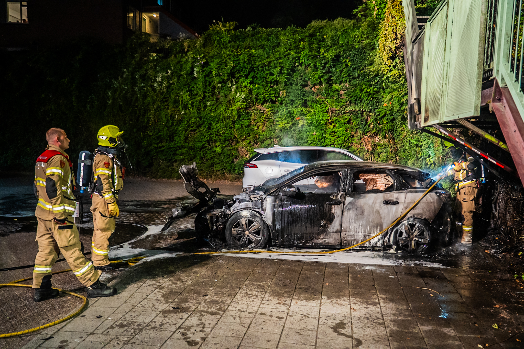 Bij aankomst van de brandweer stond het voertuig al in lichterlaaie. Het vuur werd geblust, maar de auto raakte volledig verwoest.