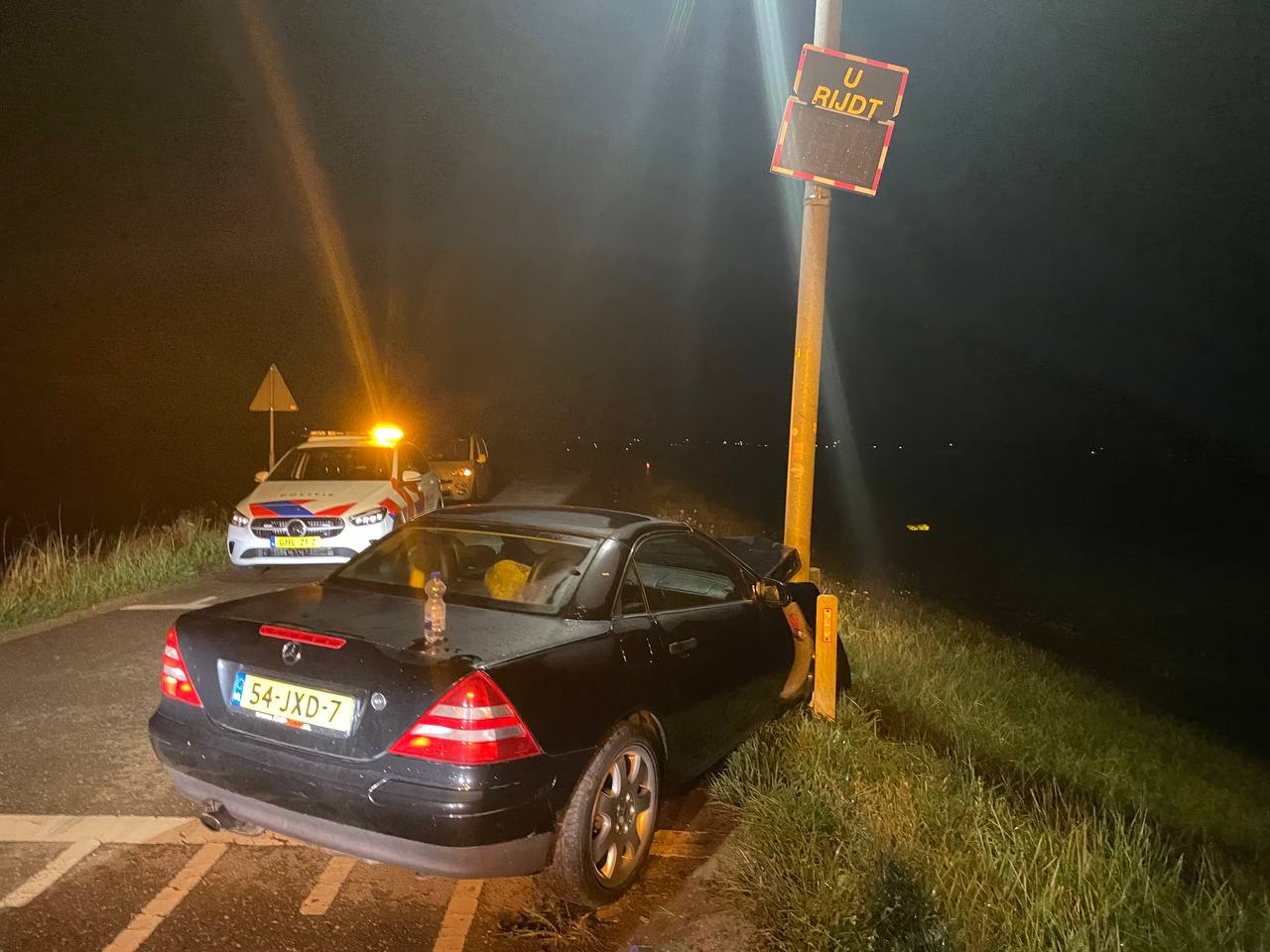 De auto botste tegen een paal langs de dijk. Opvallend is dat er op dat stuk dijk weinig palen staan, maar de auto kwam juist tegen die ene tot stilstand.