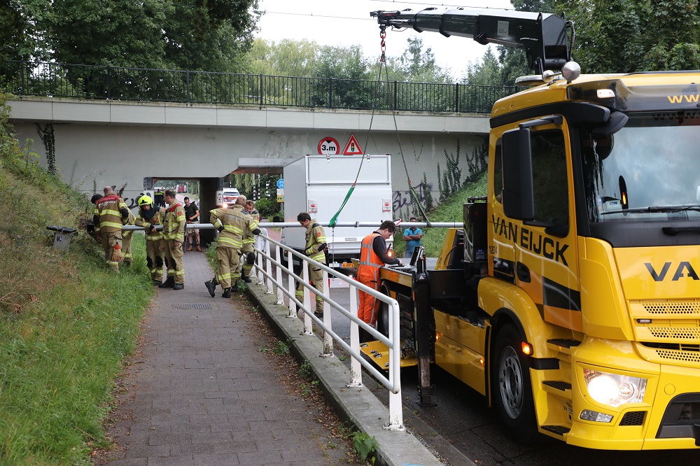 Bakwagen komt vast te zitten onder waarschuwingsbord