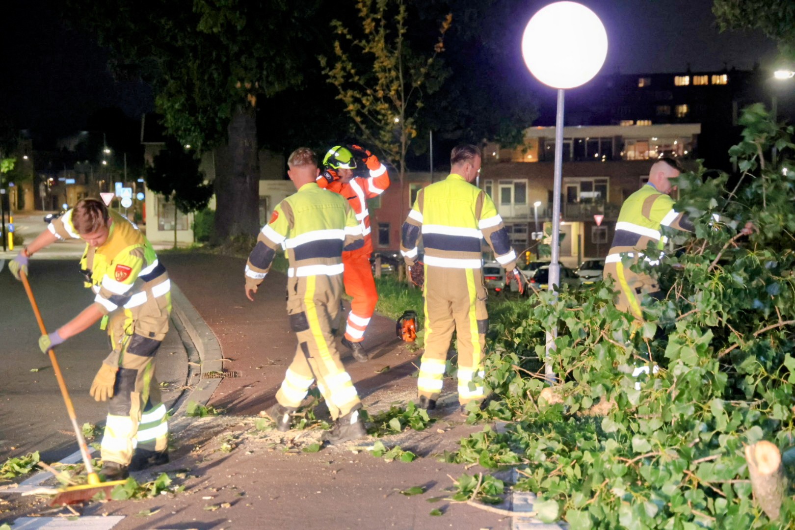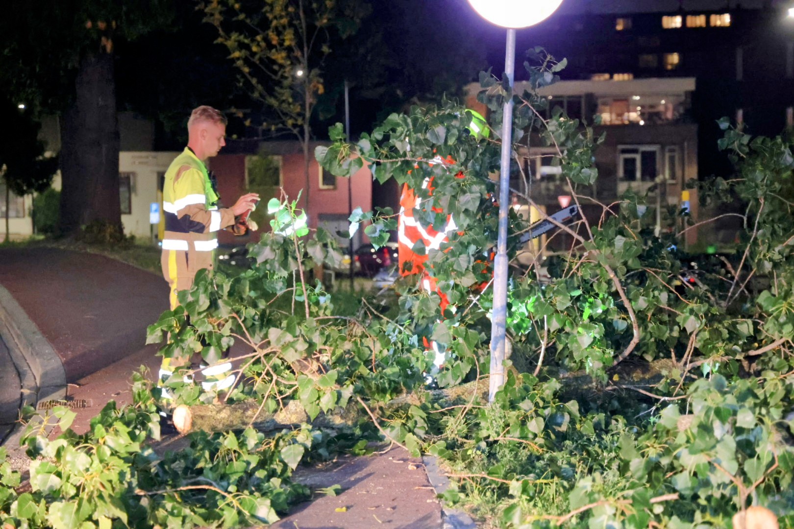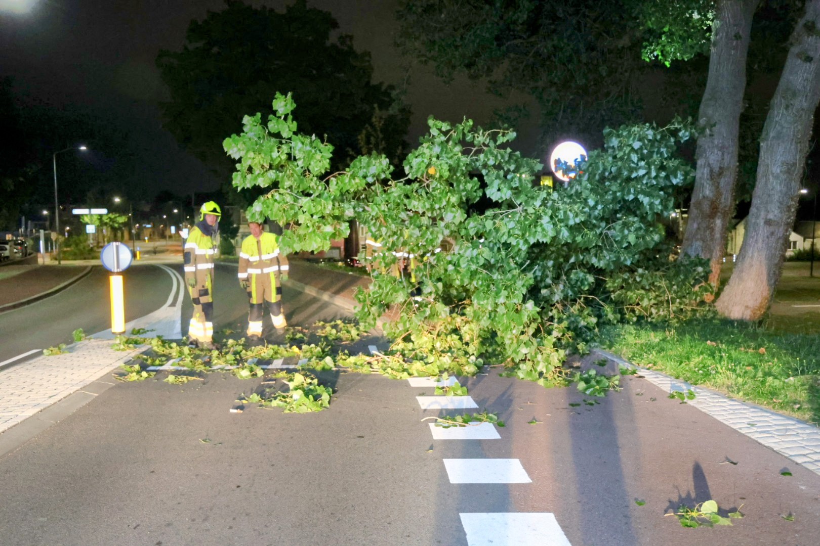 Een grote tak was afgebroken van een boom en belandde op de rijbaan. De brandweer kwam ter plaatse en zaagde de tak in stukken om de weg weer vrij te maken.