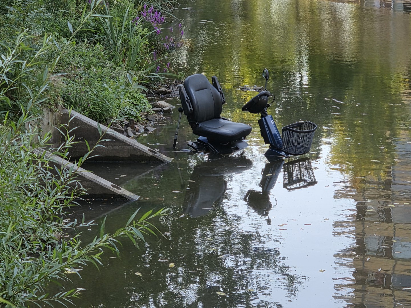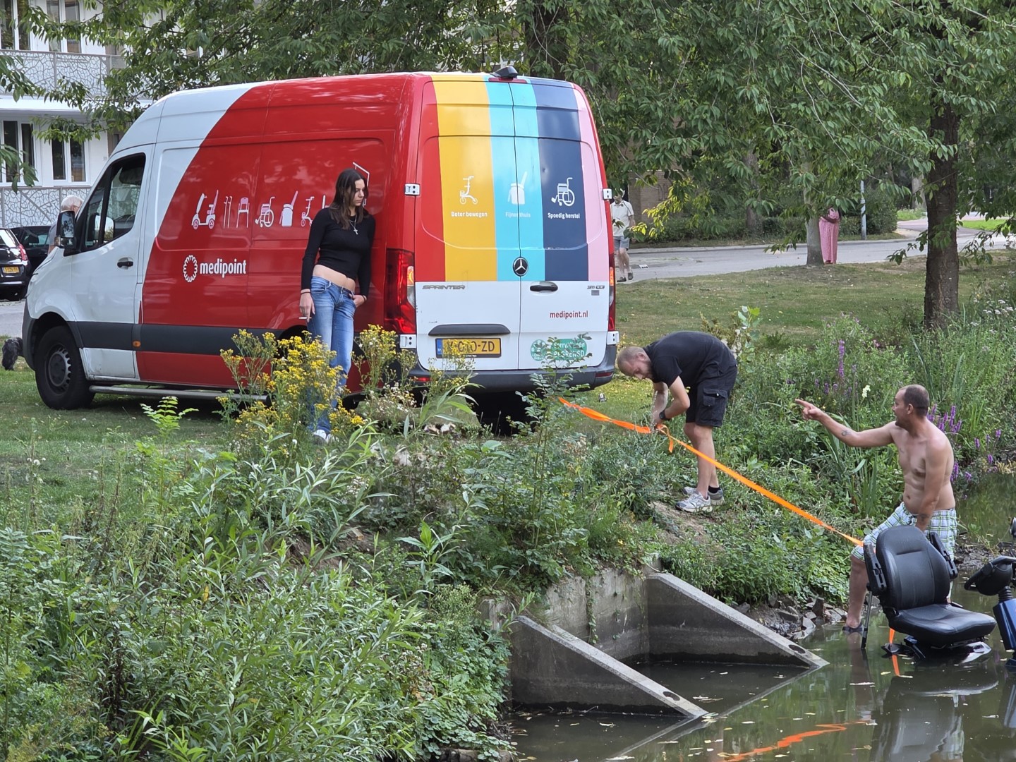 De scootmobiel liep zware waterschade op en wordt als verloren beschouwd. Hulpmiddelenleverancier Medipoint haalde het voertuig uit het water en stelde de man meteen een vervangend exemplaar ter beschikking.