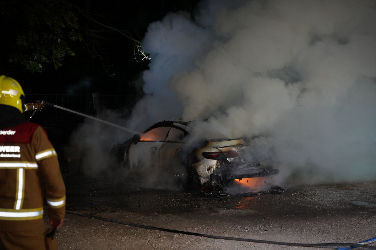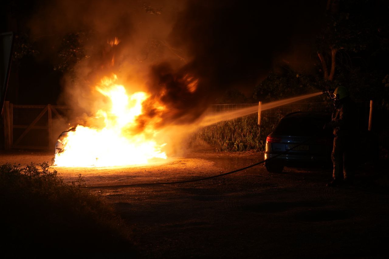 Op een parkeerplaats bij het bos stond een witte Mercedes in lichterlaaie. Een naast geparkeerde Audi RS6 liep door de hitte lichte schade op. De brandweer kon het vuur blussen, maar de Mercedes ging volledig verloren.