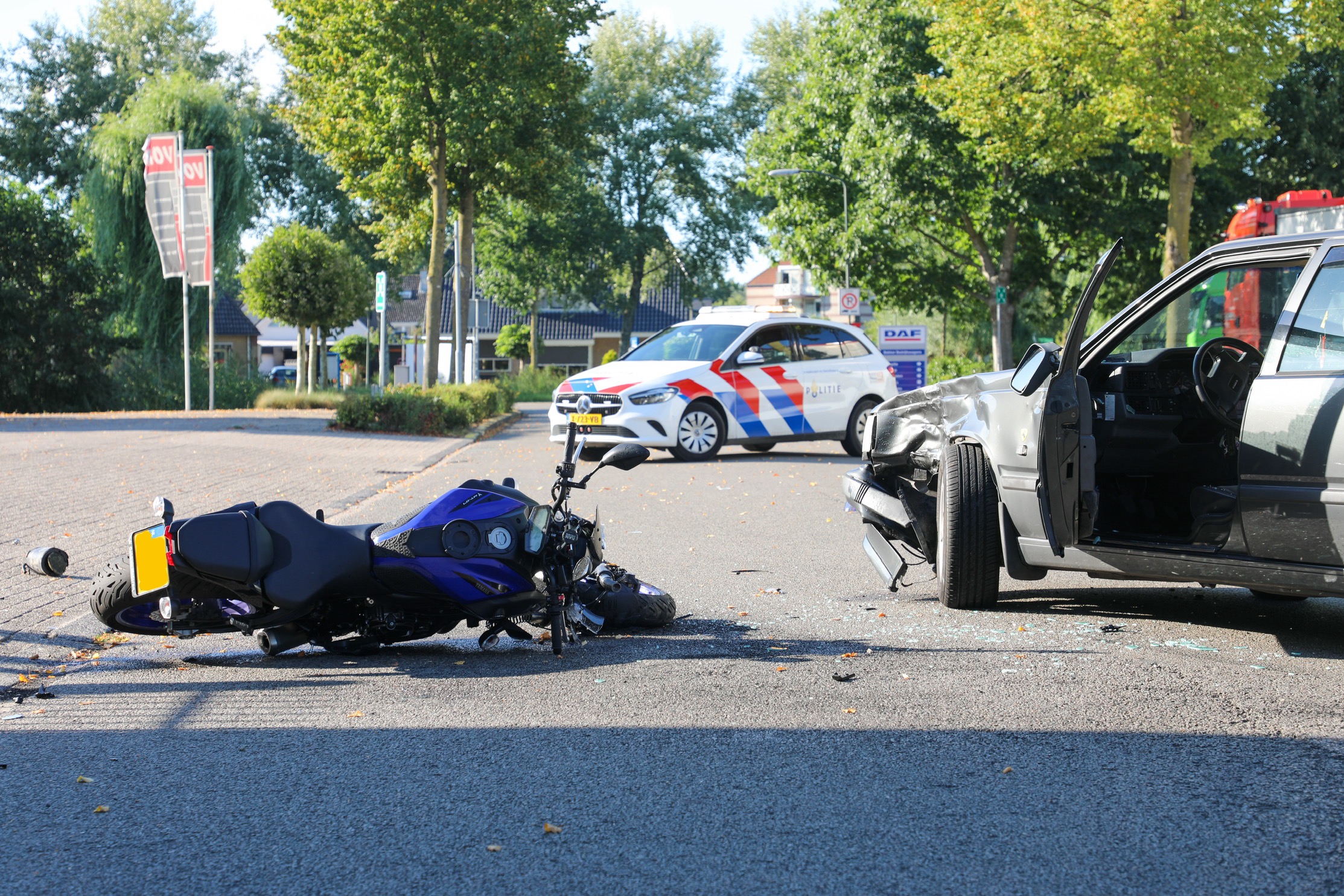 Het ongeval gebeurde rond 17.15 uur toen een automobilist vanaf een bedrijfsterrein de weg opreed en in botsing kwam met de motor. De motorrijder is met verwondingen per ambulance naar het ziekenhuis gebracht. De automobilist, een jongeman, bleef ongedeerd. Door de klap vloog de motor enkele meters door de lucht.