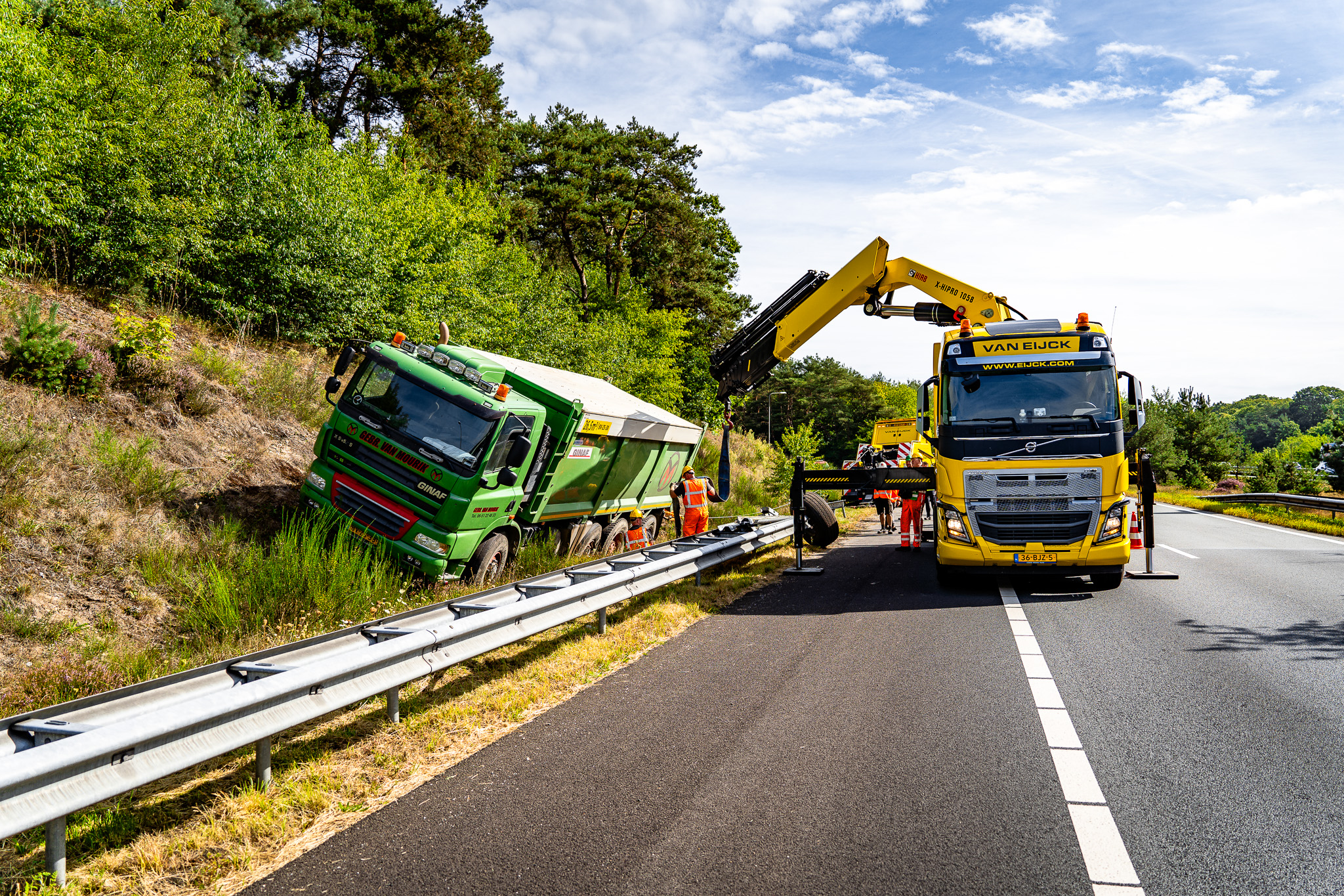 WOLFHEZE – Bij knooppunt Grijsoord is in de nacht van dinsdag op woensdag een vrachtwagen in de berm beland. De kiepwagen raakte door een nog onbekende oorzaak van de weg en kwam na een stuk vangrail te hebben geraakt tot stilstand in de berm.