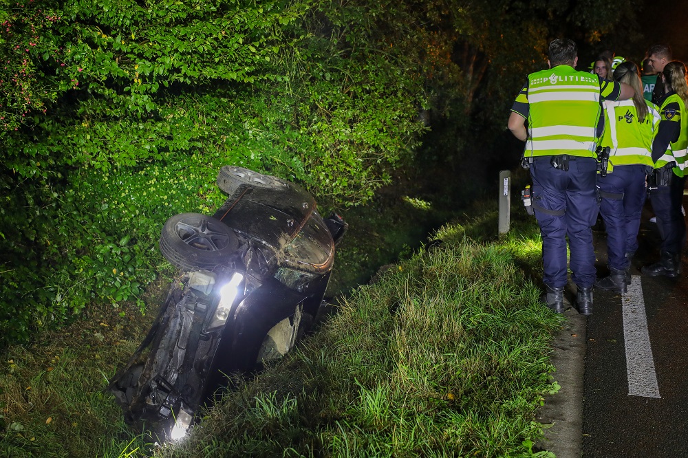 Een automobilist die vanuit de richting Barneveld kwam, raakte door nog onbekende oorzaak van de weg. Het voertuig reed door de berm en bosschages en belandde uiteindelijk in een sloot nabij de Walhuisweg. De bestuurder bleef ongedeerd, maar zijn auto liep forse schade op.