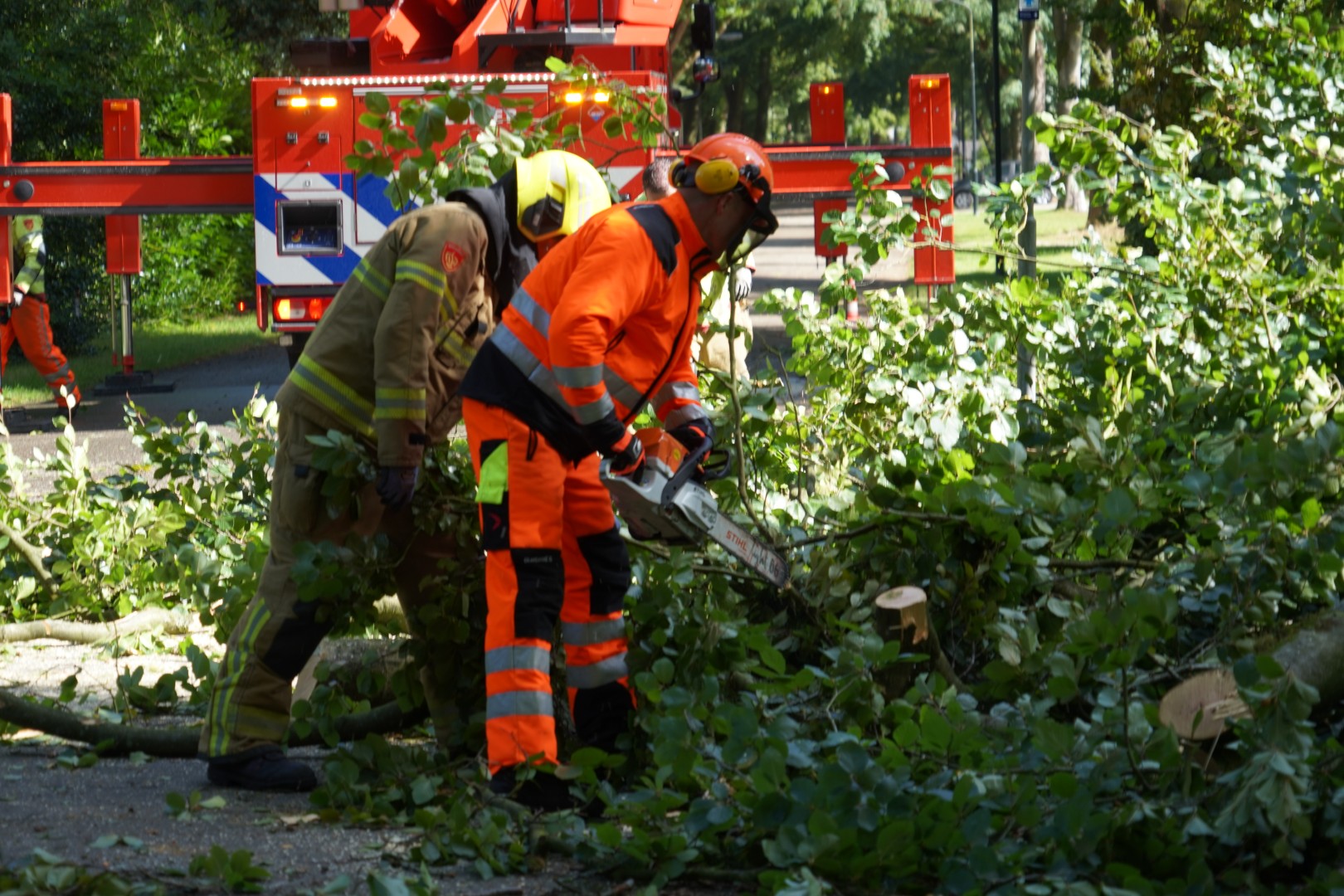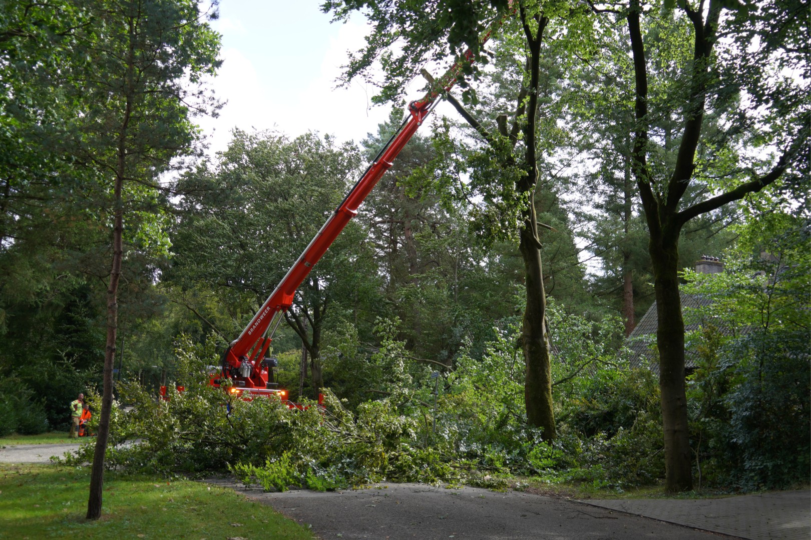 Met behulp van een hoogwerker zijn de loshangende takken verwijderd. Vervolgens zaagde de brandweer de takken in stukken en werd de weg weer vrijgemaakt.