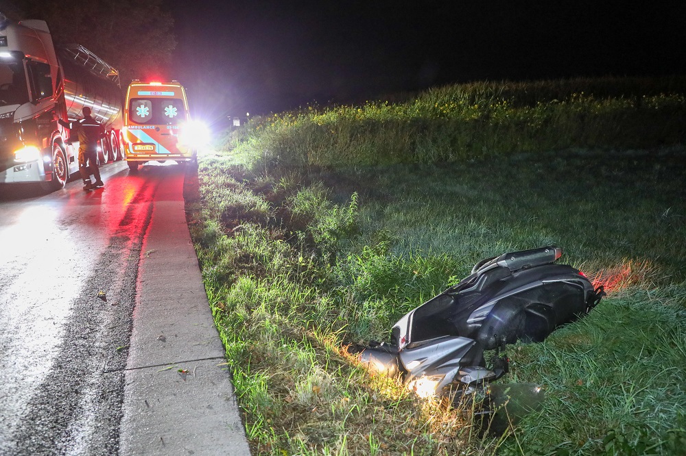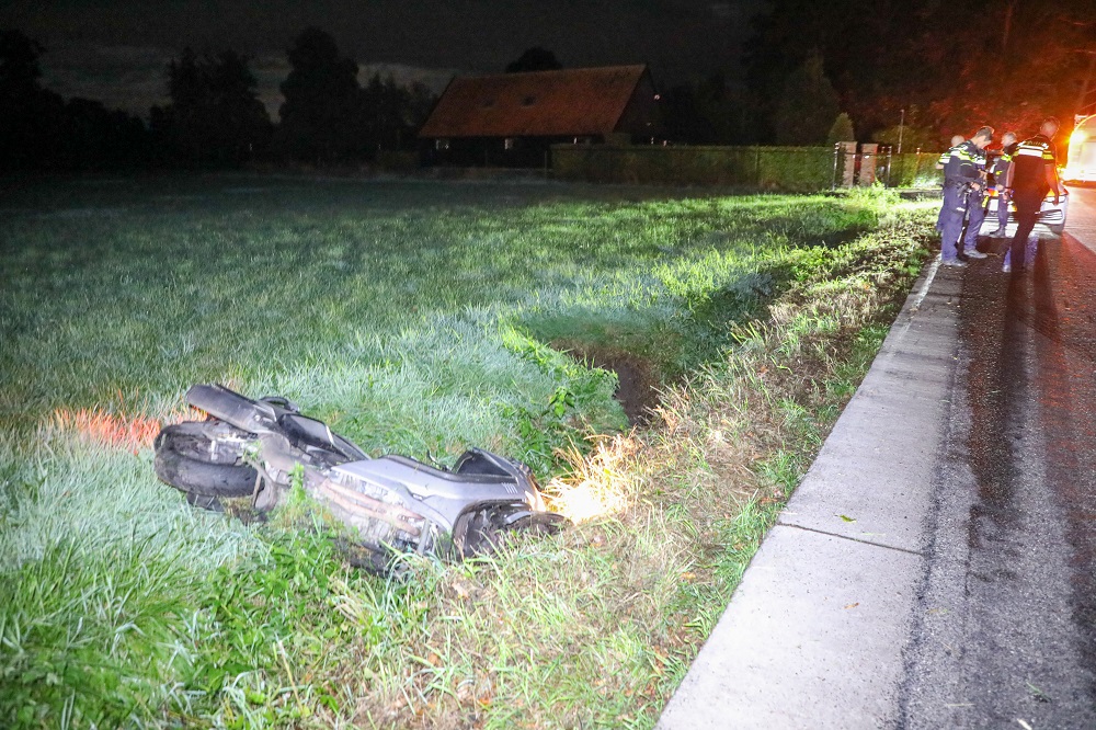 De motorscooter wordt door een bergingsbedrijf uit de sloot gehaald. Over de schade aan het voertuig is nog niets bekend.